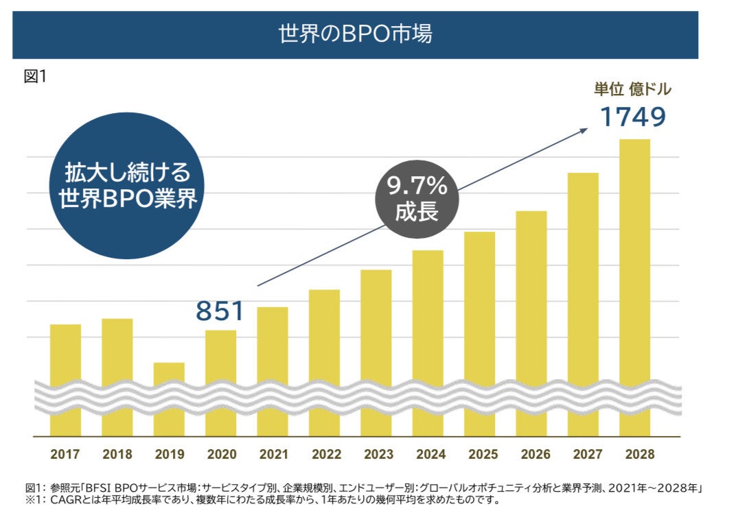 世界のBPO市場は2021年から2028年にかけてCAGR(年平均成長率)が9.7%成長し、2028年には1749億ドル規模に達する見通しです。その成長の背景には以下の2点が挙げられます。