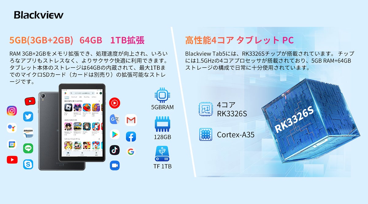 Tab5はSoCにRK3326Sを搭載し、物理メモリが3GB、仮想メモリが最大2GBとなっています。