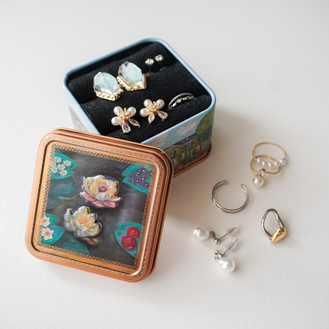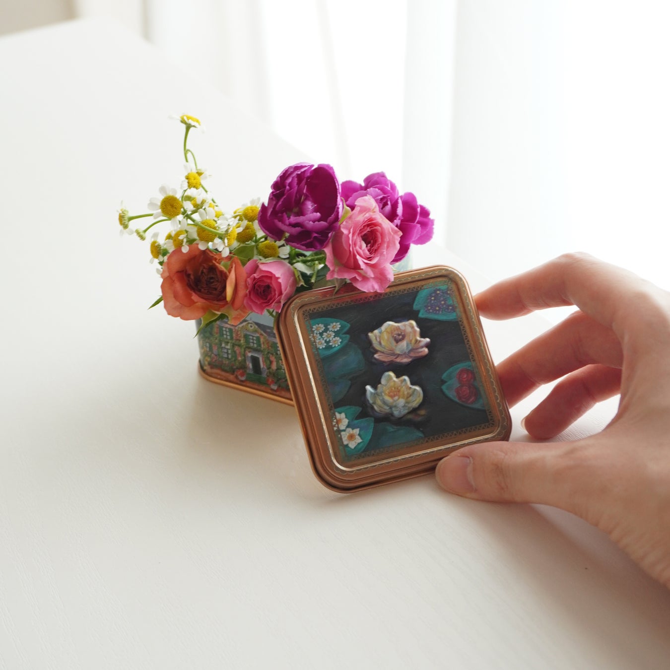 指輪ケースサイズのモネの庭缶は、お気に入りのお花を飾ったりアクセサリーや小物などを可愛く収納するなど、お菓子を食べた後も様々なアフターユースが楽しめます。