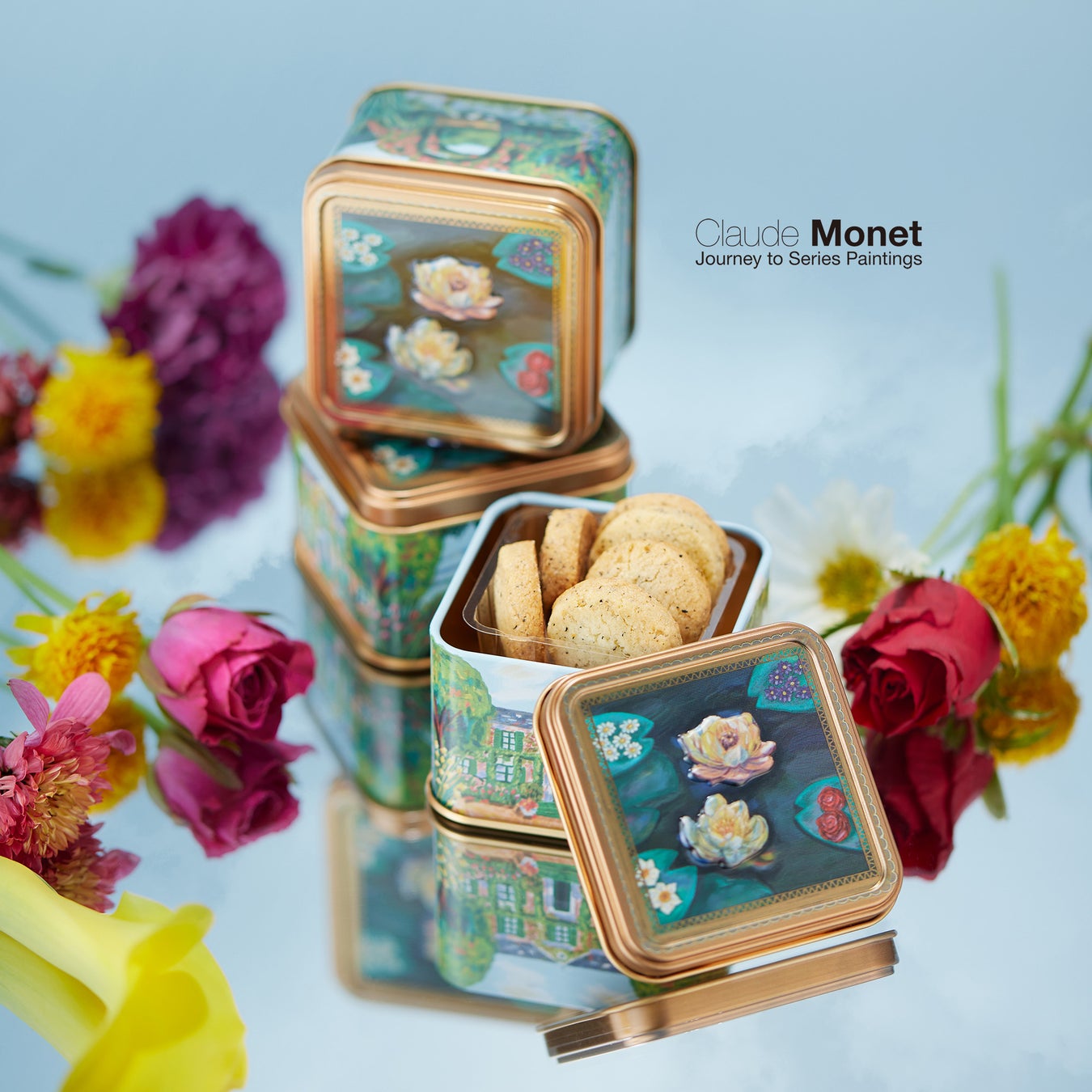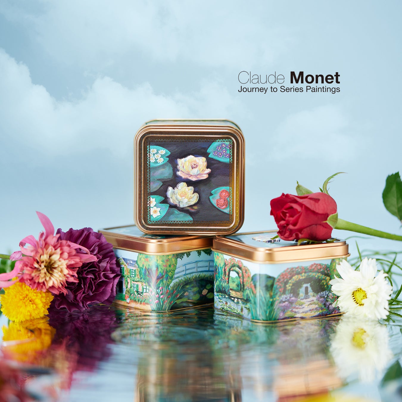 缶の蓋面にはクロード・モネの名画「睡蓮」をイメージしたイラストが描かれ、側面にはジヴェルニーにあるモネの庭の「モネの家」「散歩道」「太鼓橋と睡蓮の池」「バラのアーチと池」をイメージしたイラストが描かれています。