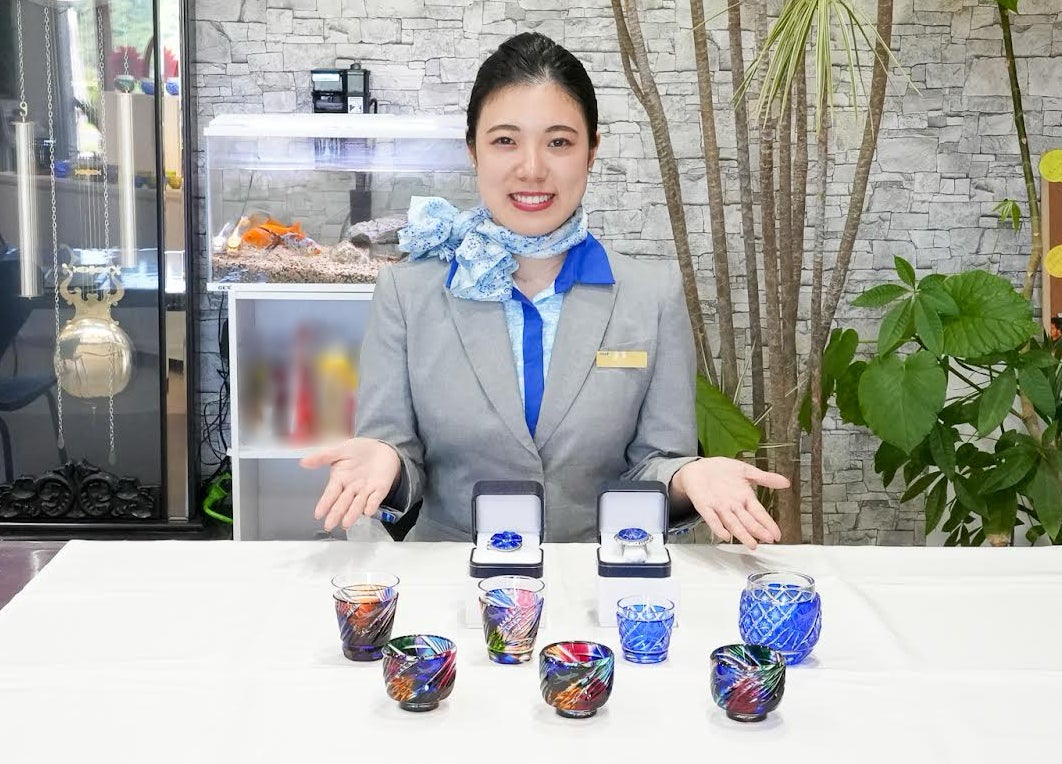 ANAの地域移住&兼業プロジェクトの一環で今年の4月より霧島市に着任した現役CAの竹之内さんが、伝統工芸品「薩摩切子」の魅力に触れた感動を多くの人に伝えたいと自らデザインを考案。そのデザインをもとに、霧島市に事業所を構える「株式会社 美の匠ガラス工房 弟子丸」がオリジナル薩摩切子として制作しました。霧島市のふるさと納税でしか手に入らない限定返礼品として、スカーフリング・ゴルフマーカー・グラス3種・猪口の全6種類(数量限定)が登場いたします。