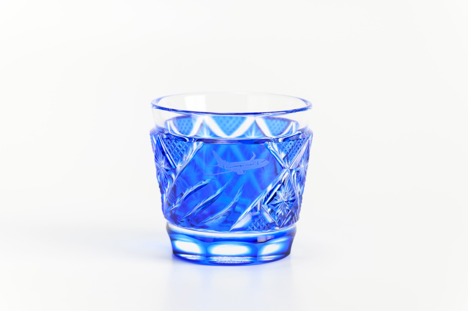このグラスを使うたびに、大空を旅しているような特別な気分になってほしいという思いでデザインされた特別な薩摩切子。カラーは青空をイメージしたブルー。グラスの表面には、飛行機以外に飛行機雲や雲が流れるイメージを、薩摩切子伝統の技「カット(切子)」などで表現。丸グラスはワインなど香りを楽しみたい飲み物などにおすすめの逸品。