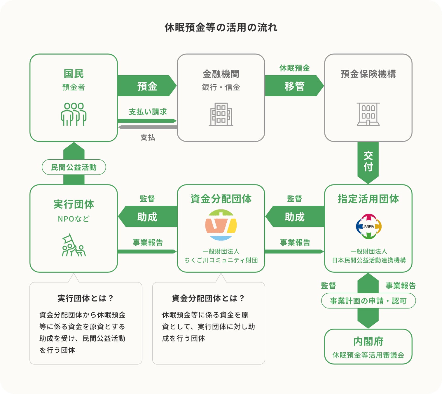 「民間公益活動を促進するための休眠預金等に係る資金の活用に関する法律」(休眠預金等活用法)に基づき、2009年1月1日以降の取引から10年以上、その後の取引のない預金等(休眠預金等)を社会課題の解決や民間公益活動の促進のために活用する制度が2019年度から始まりました。