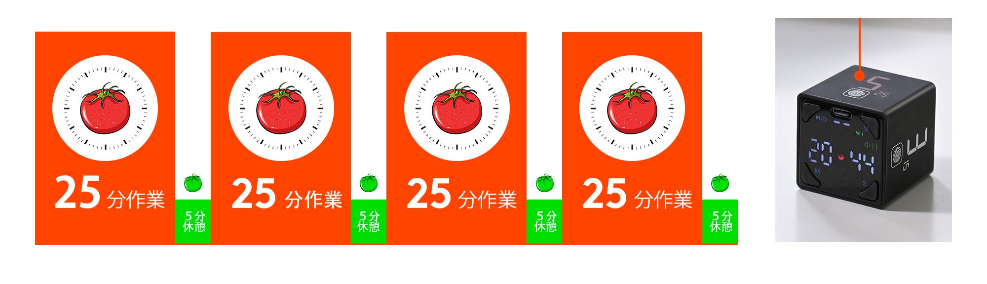 Ticktime Cubeは、数字5の面の指紋マークを長押すだけで、25分+5分は1セットで、4回繰り返されるように始まります。