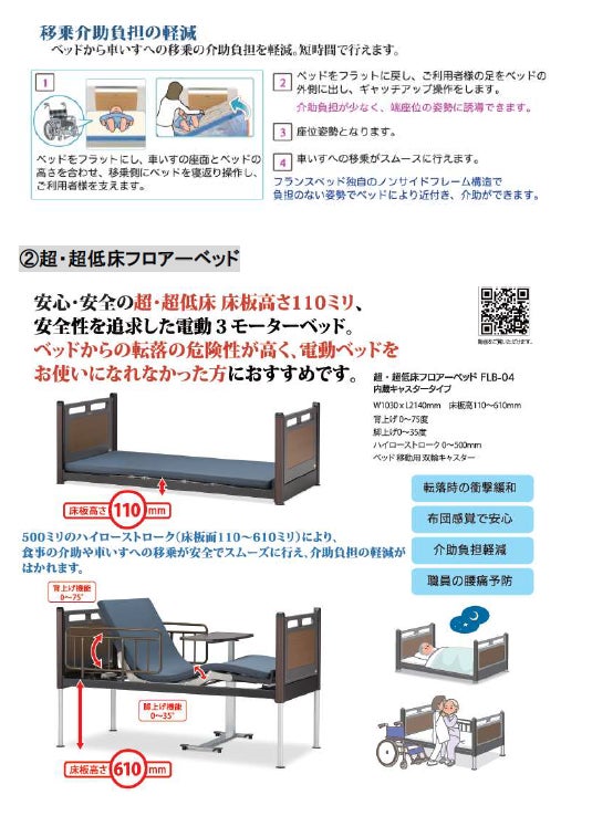 フランスベッドでは、介護者の労力軽減や生産性向上を図るとともに、利用者のQOLの向上を目指す介護ベッドを展開しています。本サービスのレンタル対象は、①寝返りを支援する自動運転機能を備えた「自動寝返り支援ベッド」、②ベッドからの転落時の衝撃を緩和できる「超・超低床フロアーベッド」、③安定した座位を保持しベッドからの転落を予防する低床サイドアップ3モーターベッド の3種類。(※参考資料)