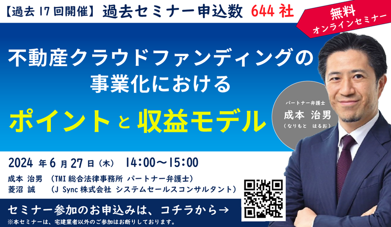今回のセミナーでは、TMI総合法律事務所 パートナー弁護士 成本治男先生より不動産クラウドファンディングの事業化におけるポイントと収益モデルについて解説いただきます。