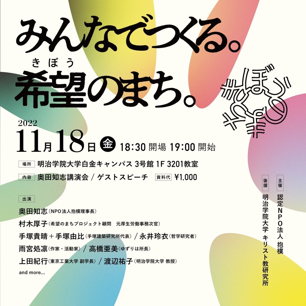 認定NPO法人抱樸はふるさと納税でのキャンペーンに合わせて、東京で希望のまちの進捗報告イベントを開催いたします。豪華ゲストも参加予定です。