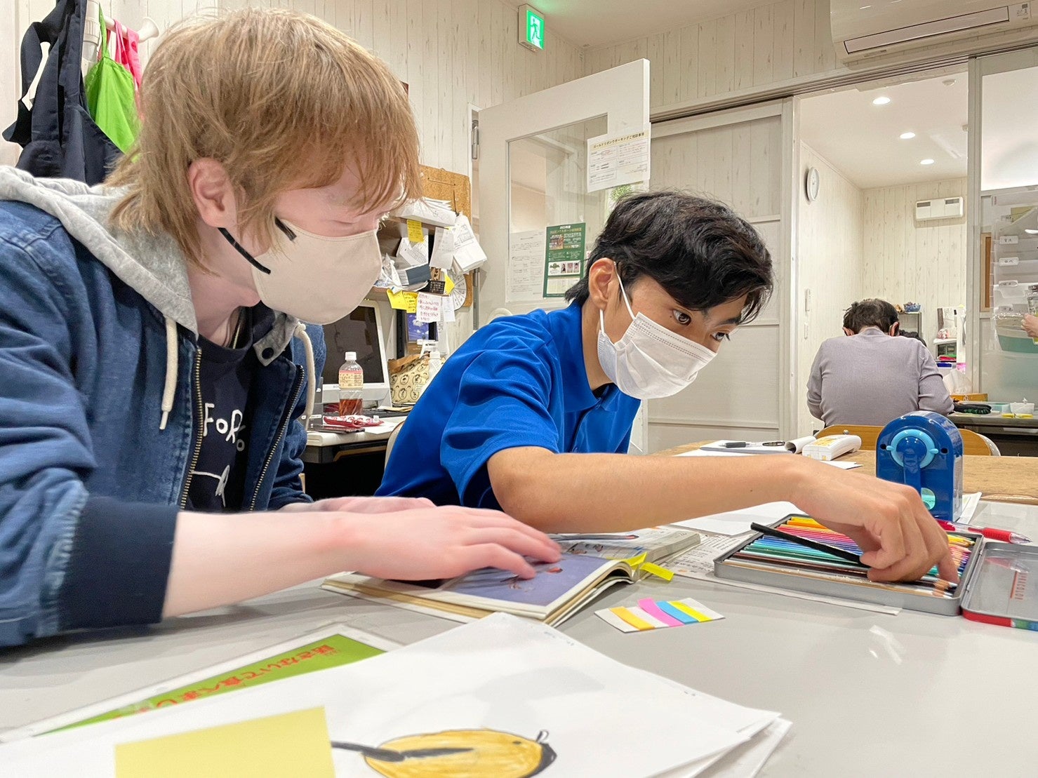 作品のタイトルで行き詰まった時には他の利用者の方々も巻き込んで考えました。「冷麺に見える」という意見が面白く採用となりました。学生さんが来てくれることで、楽しい思い出が増えました。