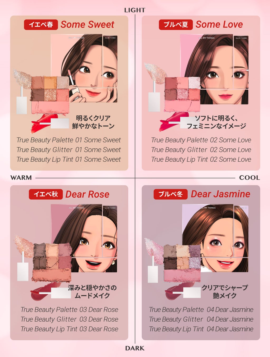 ALL MY THINGS トゥルービューティシリーズはパーソナルカラーでイエベ春・秋、ブルべ夏・冬に合わせた4色を展開。
