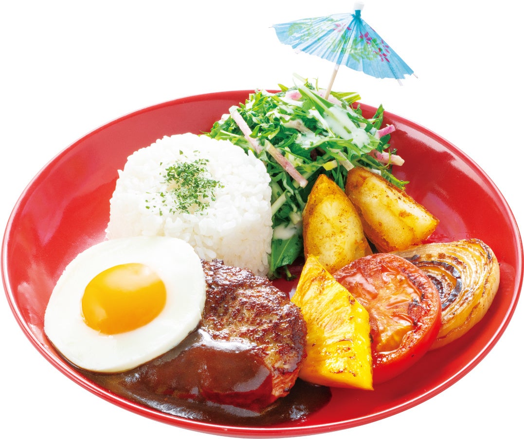 ビッグボーイでは、自慢の手ごねハンバーグや直火焼グリルチキンにお替り自由のサラダバーやスープバーがついたお得なプレートメニューを、お手頃価格でご用意しています。今回は、日本にいながらハワイ気分を味わえる「ハワイアンプレート」が登場します。ハワイの定番料理である“ロコモコ”と、甘辛いソースをつけたチキンを直火で焼くローカルフード“フリフリチキン”を、ビッグボーイ風にアレンジしました。今年の夏はビッグボーイへ“ハワイ旅行”にお越しください。