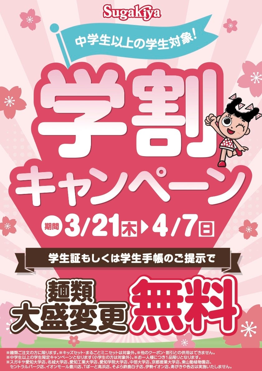 また、春の新生活スタートを応援して、3⽉21⽇(⽊)から4⽉7⽇(日)までの18⽇間、学割キャンペーンを実施いたします。学生証のご提示で、麺類の大盛りへの変更を無料とさせていただきます。