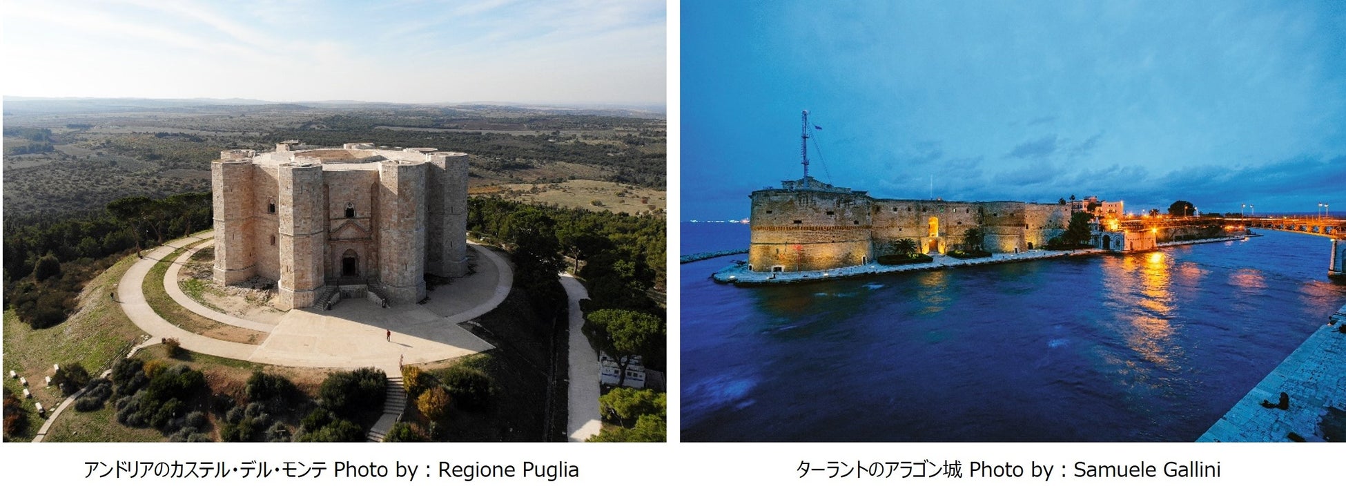 プーリア州での旅は、中世の城とこの地ならではの唯一無二の建造物の発見の連続であり、かつては自然豊かでハヤブサ狩りが出きる場所でした。大きな宮殿のあるルチェーラから、ボヴィーノの荘厳なドゥカーレ城、海の際に建つヴィエステのズヴェヴォ城、そしてダウニア地方とガルガーノ地方を360度見渡すことができるモンテ・サンタンジェロの要塞。州都バーリにあるノルマン・ズヴェヴォ城、100の扉がある王宮として知られるジョイア・デル・コッレ城など、個性的な城ばかりです。