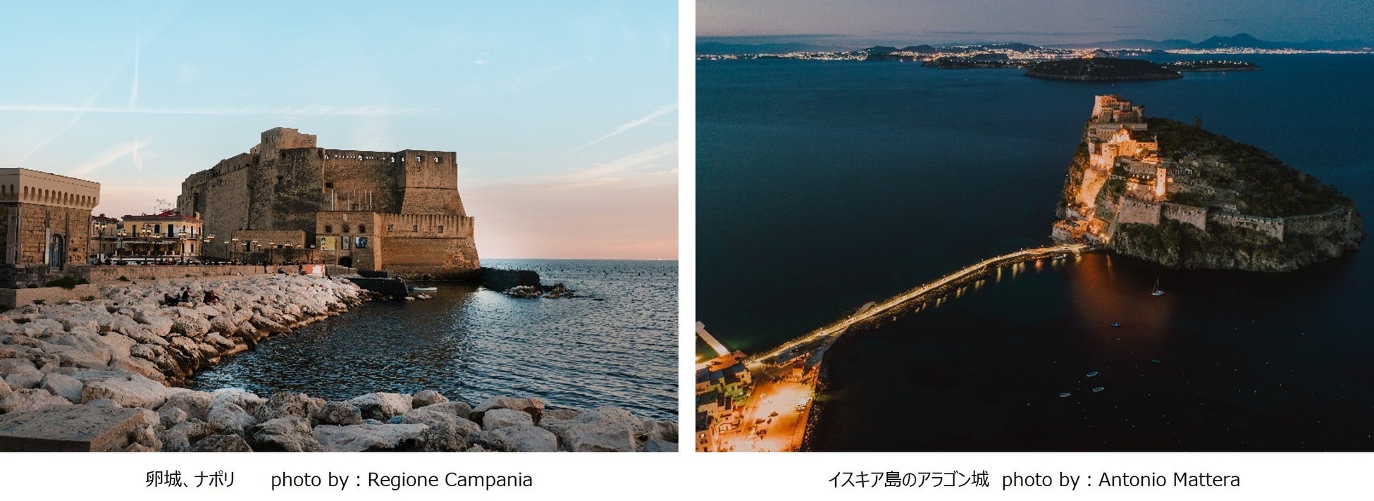 ナポリの卵城、サレルノ湾を望む標高300mにそびえるアレキ城、そして海に浮かぶ島々に残された要塞と城。