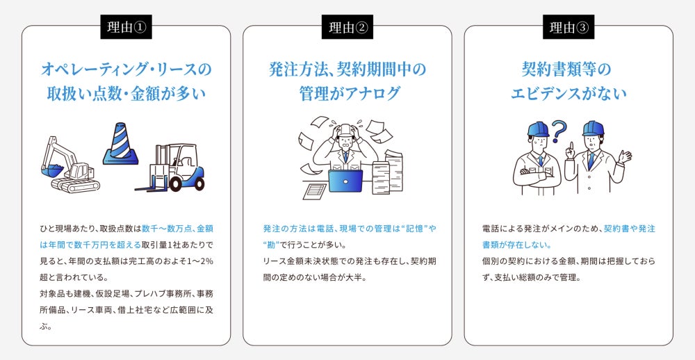 「Lease X」は従来の方法では困難とされている現場単位のリース契約を網羅的に管理し、会計情報としてのエビデンスを確保します。