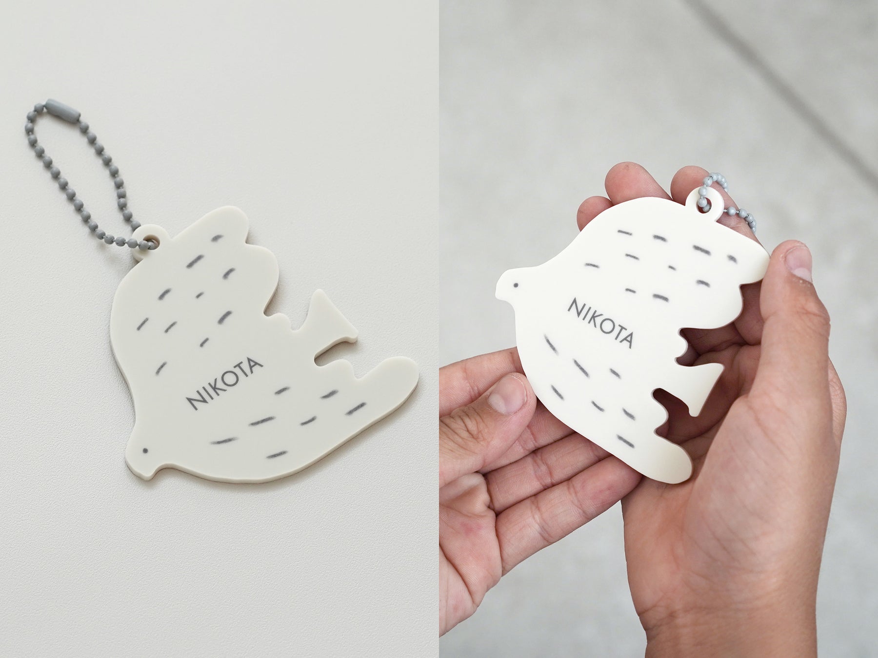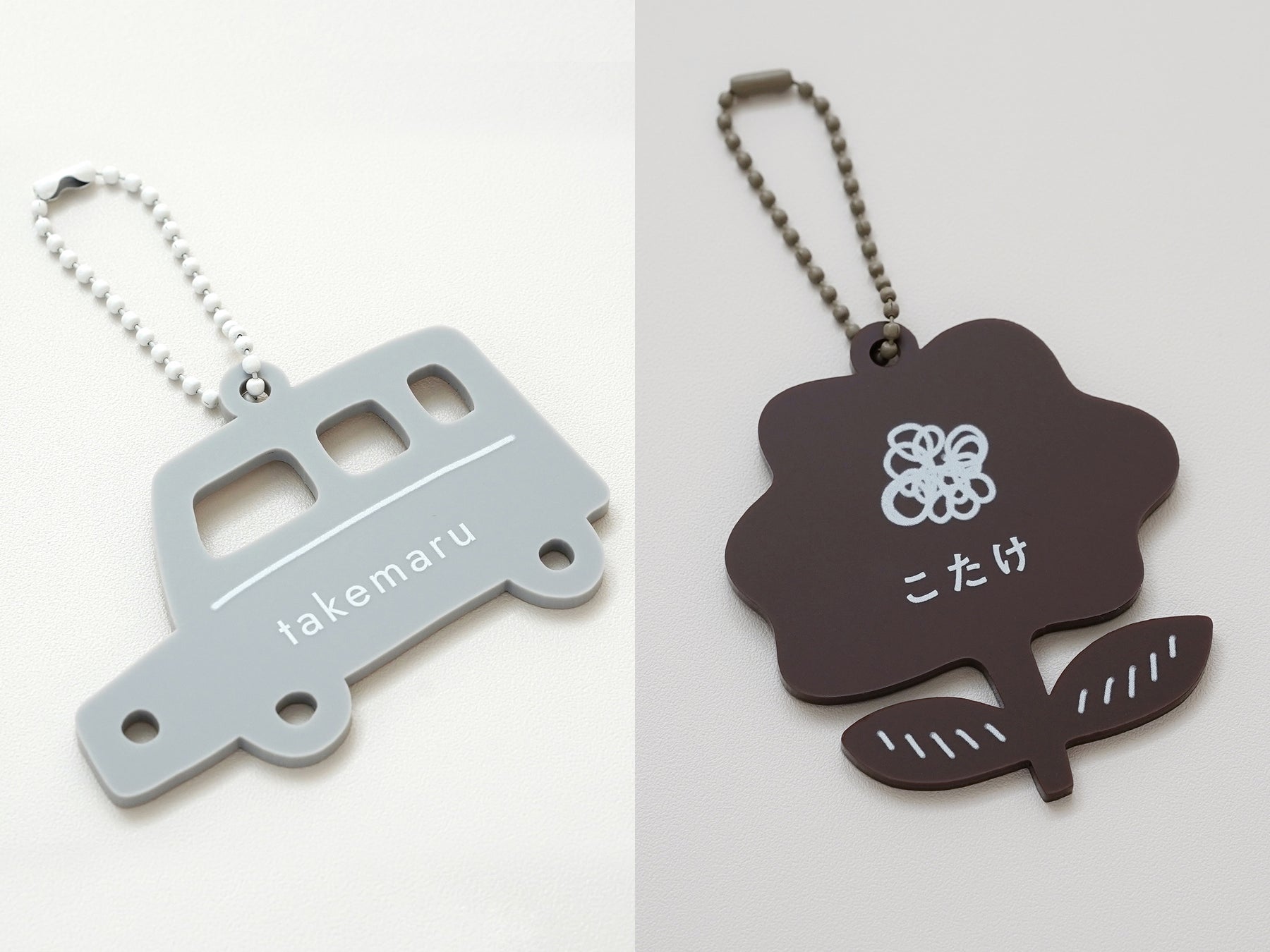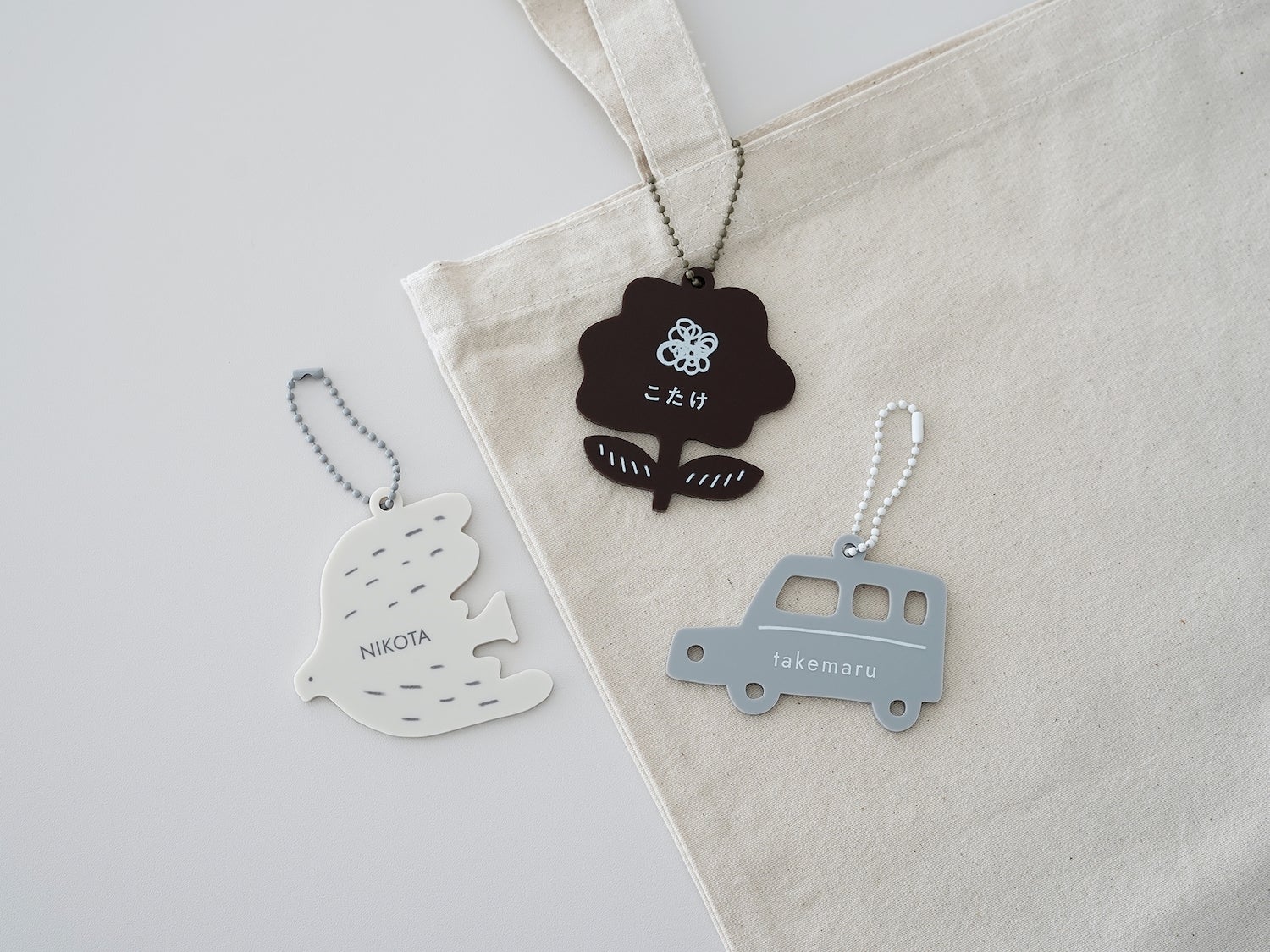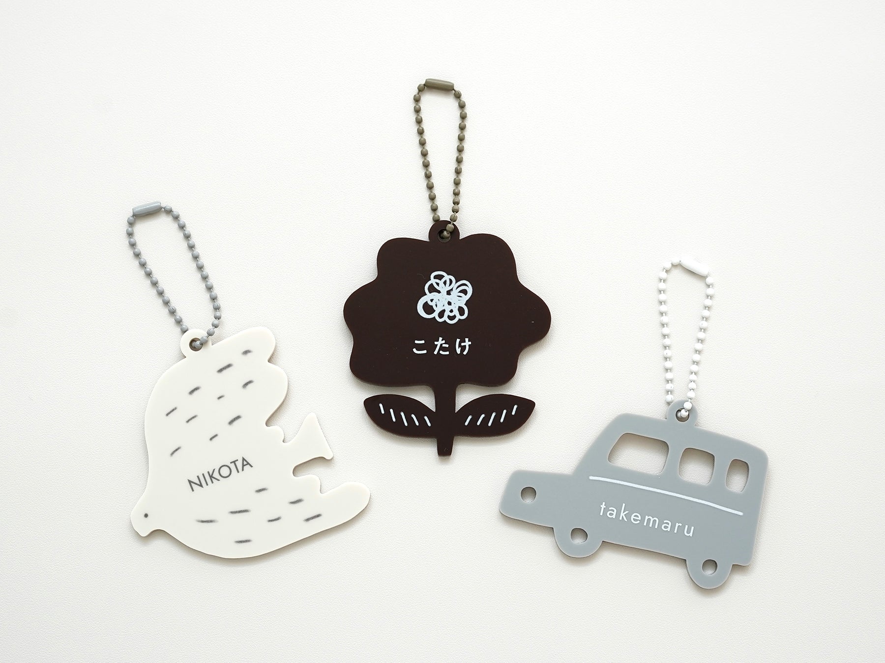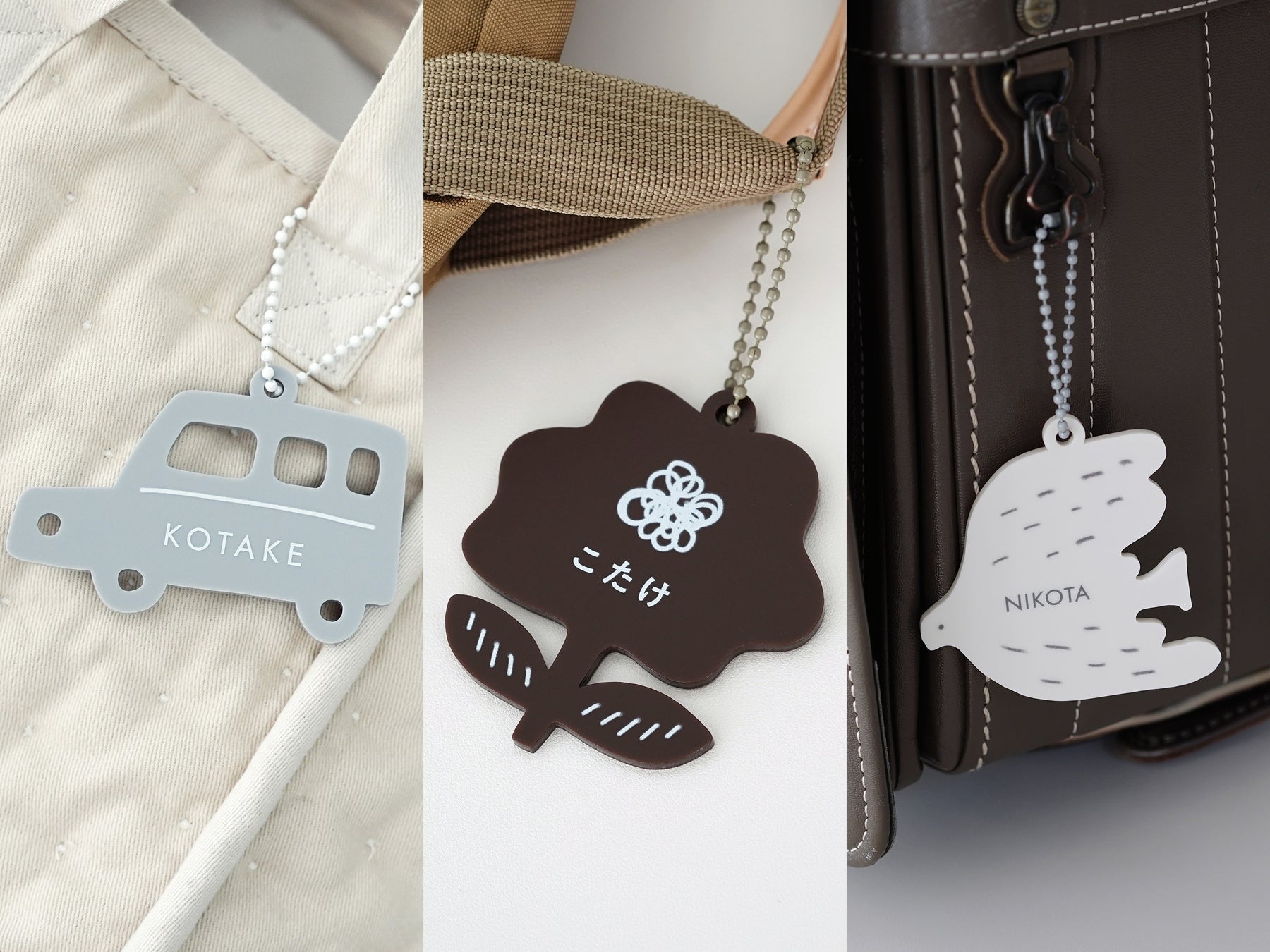 アイボリーの鳥(グレーのチェーン)、ブラウンの花(グレージュのチェーン)、グレーの車(ホワイトのチェーン)の3種類からお選びいただけます。