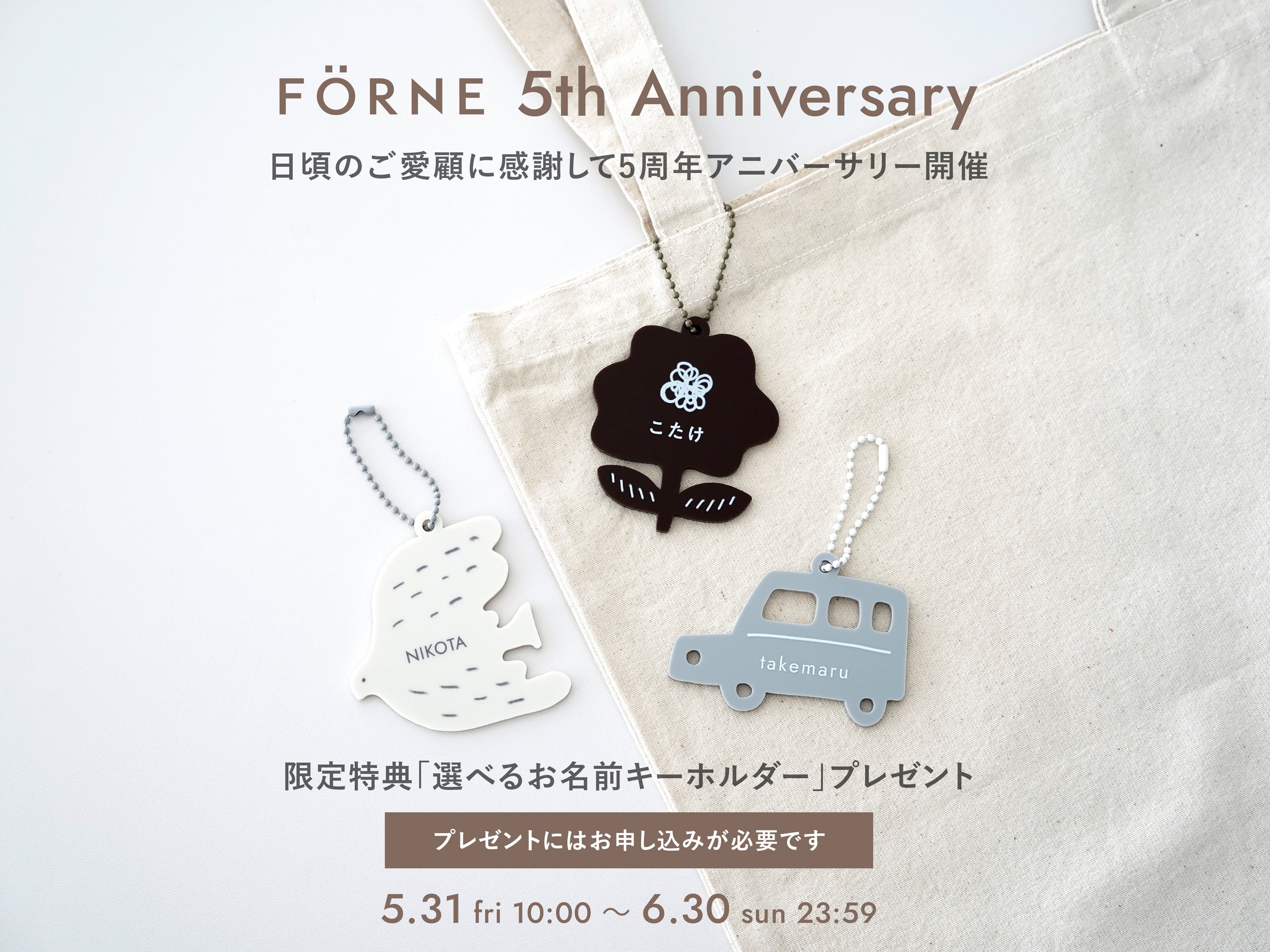 今年は5周年という節目の年で、いつもより少しだけスペシャルに、3つのデザインから選べるノベルティをご用意しました。お名前キーホルダーのデザインは、フォルネのアイテムにもよく登場する鳥と花と車。性別を限定しないモチーフでもあるので、お子様と相談したり、お子様に似合うものを想像したりして選んでもらえたらうれしいです。(フォルネディレクター 伊場麻世)