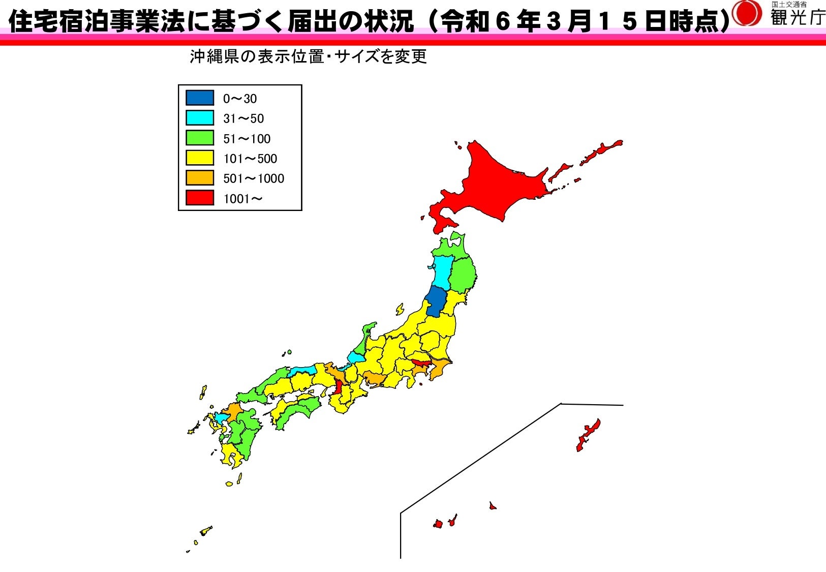 上の図は、民泊新法に基づいて届出された民泊施設の数を都道府県別にあらわしたものですが、1000件を超えているのは北海道・東京・大坂・沖縄のみです。