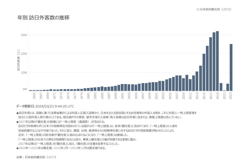 その回復度合いはすさまじく、たとえば2023年の訪日外客数は25,066,350人なのですが、これは過去最高の31,882,049人を記録した2019年の約78.6%にもなる人数です。