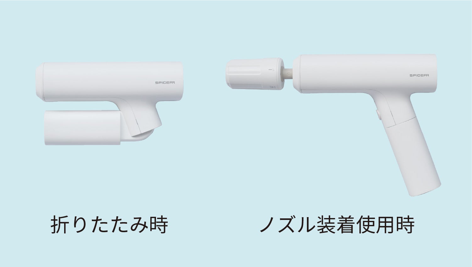 サイズは176mm×104mm×68mm(折りたたみ時)とポケットに入るほどの大きさで、重量はわずか約800g。3段階の圧力調整と5パターンの噴出角度を選べる噴出ノズルにより15段階の噴出パターンを選べます。