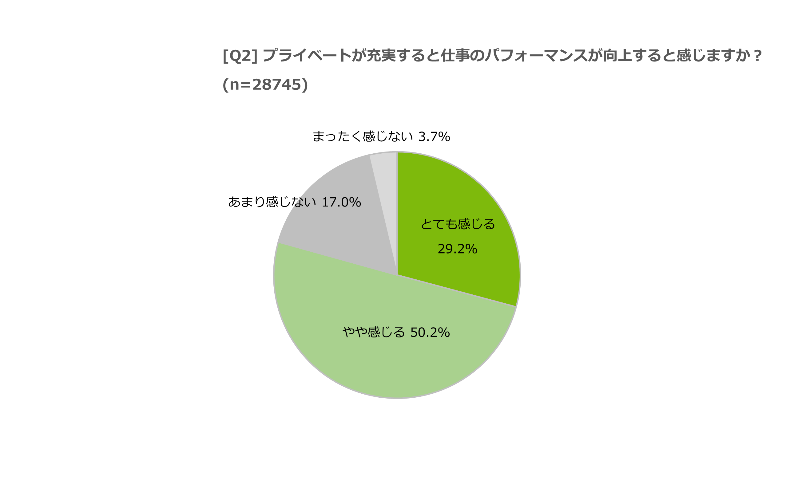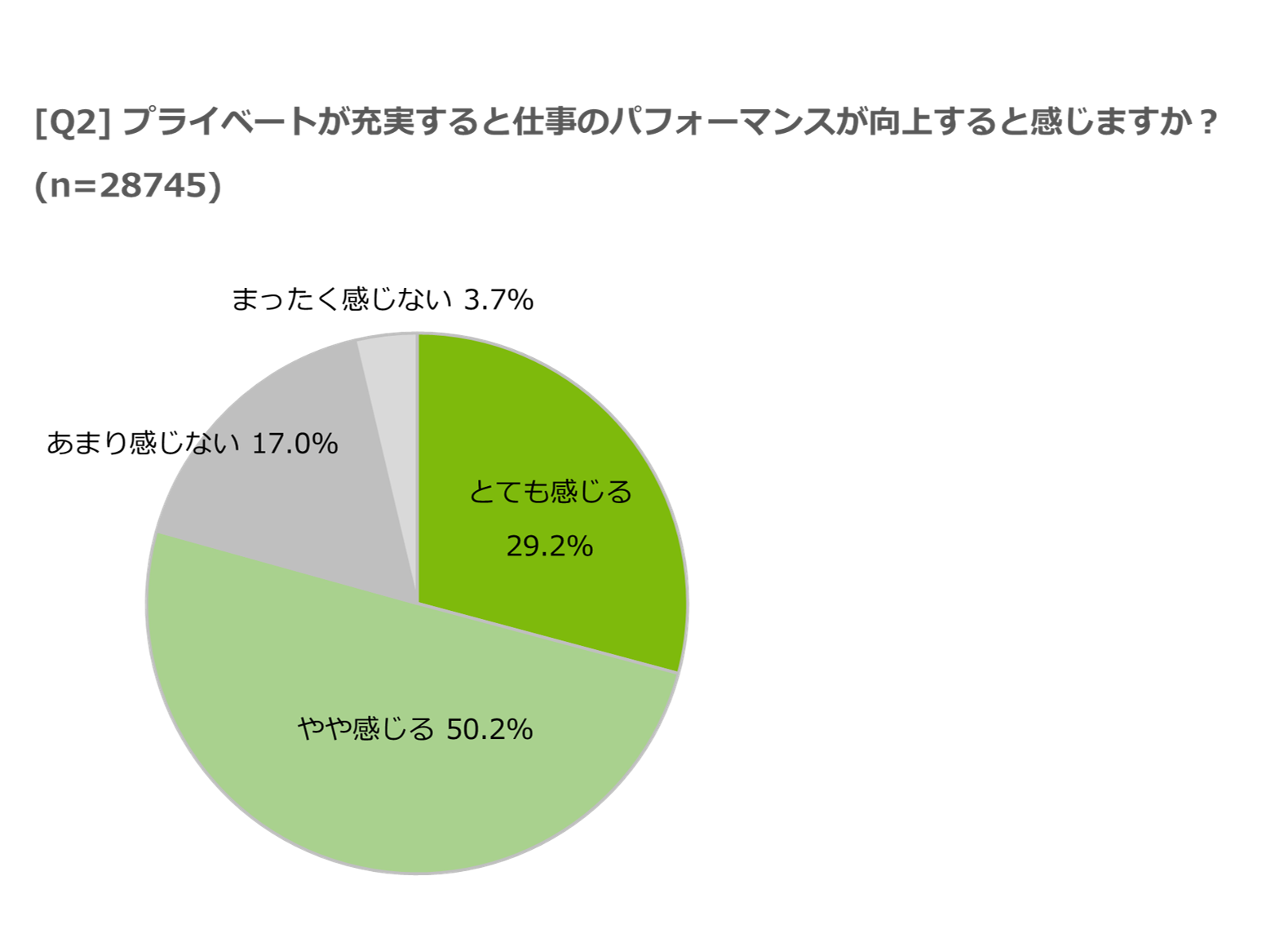 次にプライベートと仕事の相関性についてを聞いたところ、労働者の8割がプライベートが充実すると仕事のパフォーマンスが向上すると感じていることが明らかになりました。昨今注目を集めるワークライフインテグレーションの考え方にもあるように、プライベートと仕事の相互関係を理解することが、今後の働き方改革の鍵となってくるようです。プライベートの時間を作るための取り組みを考えるのではなく、仕事とプライベートをどのように上手く繋げられるかを労務関係者は考えていく必要があります。