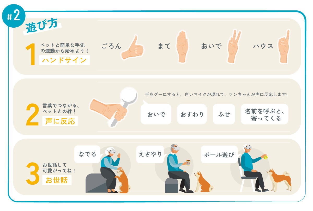 高齢者施設に特化した国内初*のMR(複合現実)技術を活用したバーチャルアニマルセラピーで、今年7月に発売を開始しました。飼育環境や年齢等の理由で犬を飼えない施設入居者や、実際の動物によるアニマルセラピーは実施ハードルが高いという悩みを抱える高齢者施設に向けて開発し、「VRゴーグルを通して動物と触れ合う」という新たな選択肢を提供し、日常的な癒しや安心感を届けることを目的としたコンテンツです。いつでもワンちゃんを利用することで気分がリフレッシュされることが確認*されており、実際の動物によるアニマルセラピーと同様の効果が期待される点や、MR(複合現実)技術を用いることでVRゴーグル装着時も周囲が見えるよう安全性に配慮している点、使用時の操作を出来る限りシンプルにしている点が特長です。