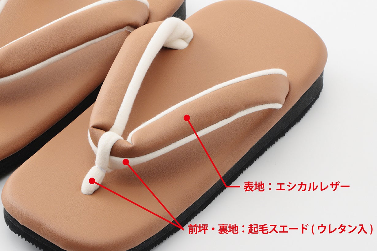 取り付けられている花緒は、前坪(指ではさむ部分)と裏地(足に接する部分)に上質な肌触りの起毛スエード生地を使用することで、従来の雪駄の花緒とは一線を画すやわらかな履き心地を実現し、さらに裏地と前坪部分の芯材にソフトなウレタンをプラスしたことで、足への負担をより減らすことに成功しました!