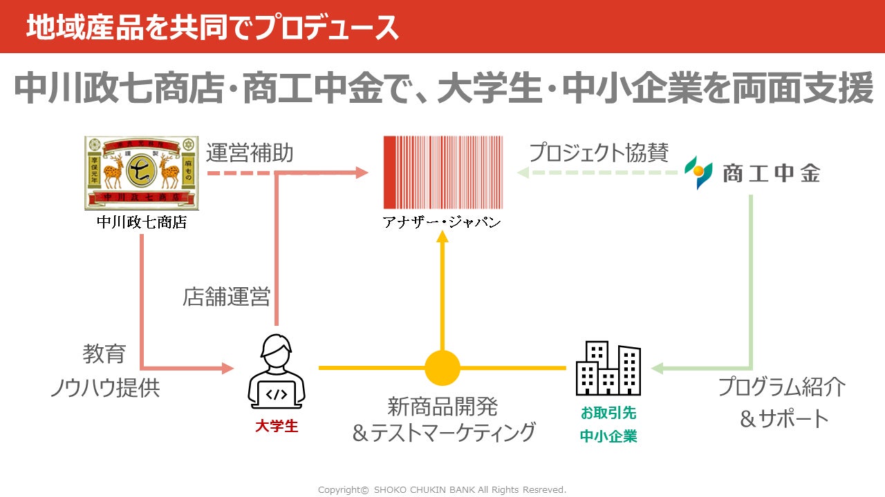 三菱地所株式会社と株式会社中川政七商店による、学生が本気で商売を学び実践する47都道府県地域産品セレクトショップ「アナザー・ジャパン」。この度、サポーター企業である株式会社商工組合中央金庫(以下、商工中金)ご協力のもと、地域メーカーとの共同商品開発プロジェクトが始動しました。このプロジェクトを通して、アナザー・ジャパンの学生と地域メーカー4社が商品開発に共同で挑戦し、2024年4月3日(水)から始まるアナザー・チュウゴクシコク展、2024年6月5日(水)から始まるアナザー・チュウブ展にて発売します。