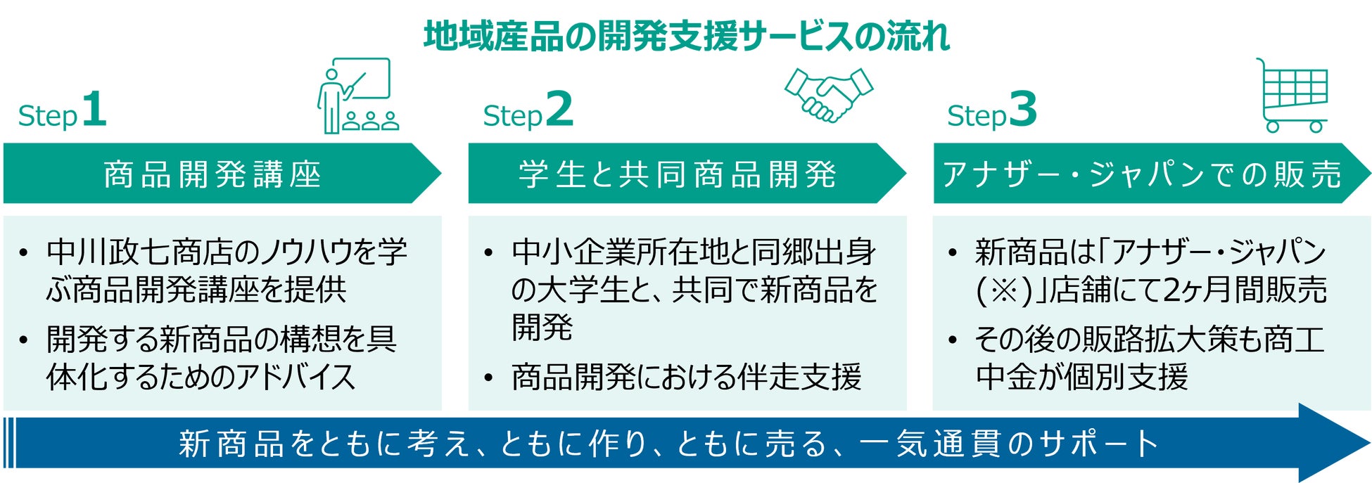 このプロジェクトは、アナザー・ジャパンのサポーター企業である商工中金の「アナザー・ジャパンとの出会いをきっかけに、新しい挑戦に踏み出す地方の中小企業を増やしたい」という想いから始動。商工中金がクライアントから商品開発に挑戦したい企業を募り、中川政七商店が商品開発講座を提供することで、商品開発に向けた準備を行いました。