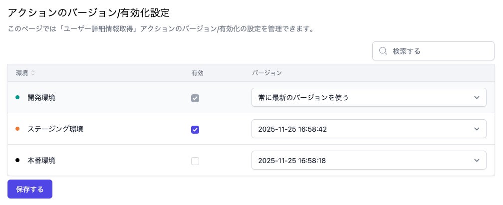 本機能は、ベースマキナ上でSQLやAPI連携、権限・承認設定を登録して画面を生成できる「アクション」を環境別に管理できる機能です。