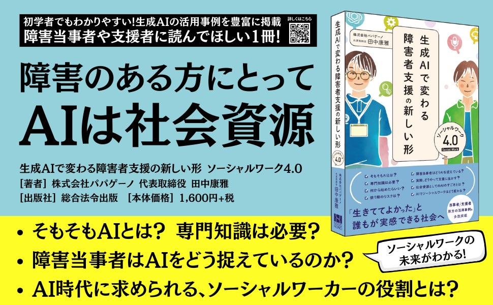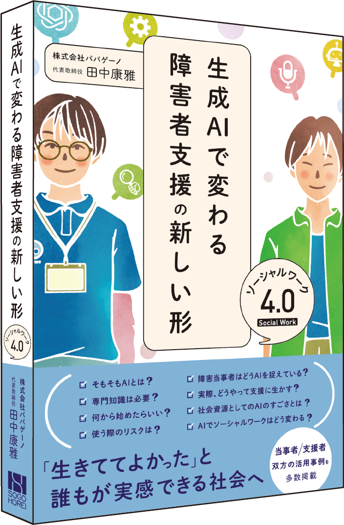 パパゲーノの障害者支援の実践事例や生成AI活用の基礎をまとめた書籍 『生成AIで変わる障害者支援の新しい形 ソーシャルワーク4.0』 (総合法令出版)を2025年3月11日に出版しています。