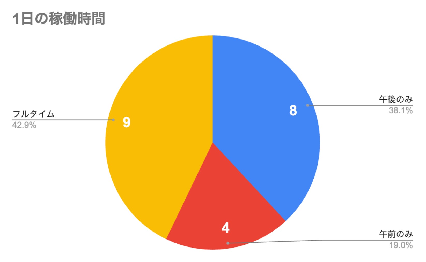 と、フルタイムの方よりも、午前のみ、または、午後のみと半日の稼働にしている方が57.1%と多いです。