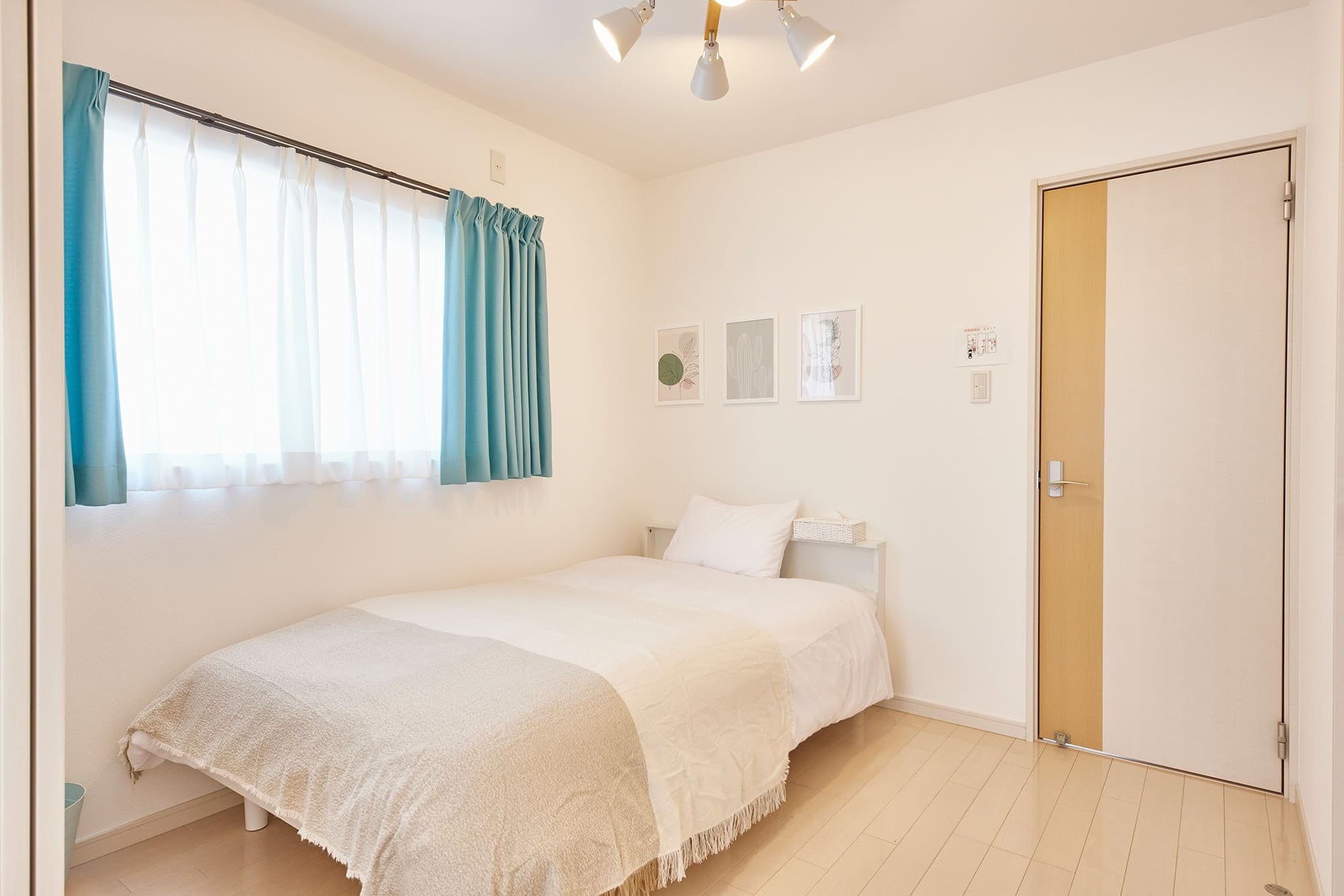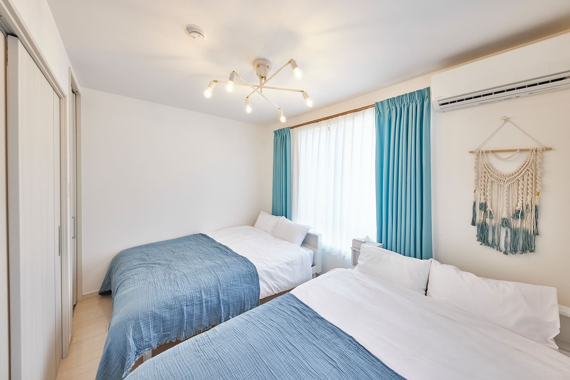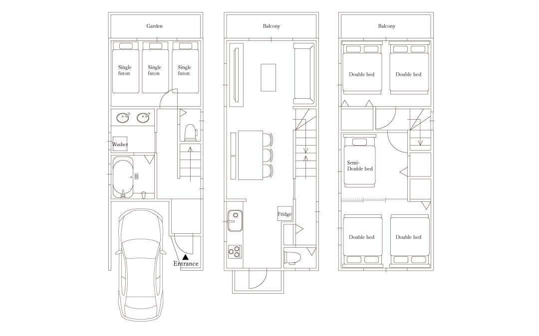 1階和室はシングルサイズの布団が3組。3階寝室には、ダブルベッド4台、セミダブルベッド1台。2階リビングエリアにあるソファは、ソファベッド(ダブル)と使用できます。