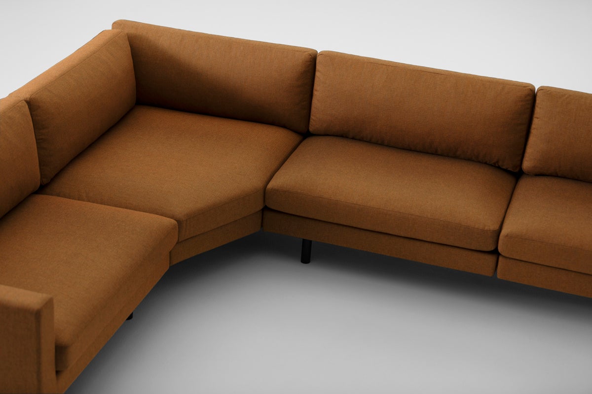 基本的なプロポーションはそのままに、生活や空間に合わせて自由にモジュールを組み合わせることができます。更にコーナータイプがシステムに加わり、美しく私たちの生活に馴染むソファのレイアウトが可能となりました。背や座のクッションも座り心地の質を向上させ、ソファの脚の形状やオープンシェルフなどの周辺アイテムも新たにデザインすることで HIROSHIMA ソファの生活が美しく進化しました。