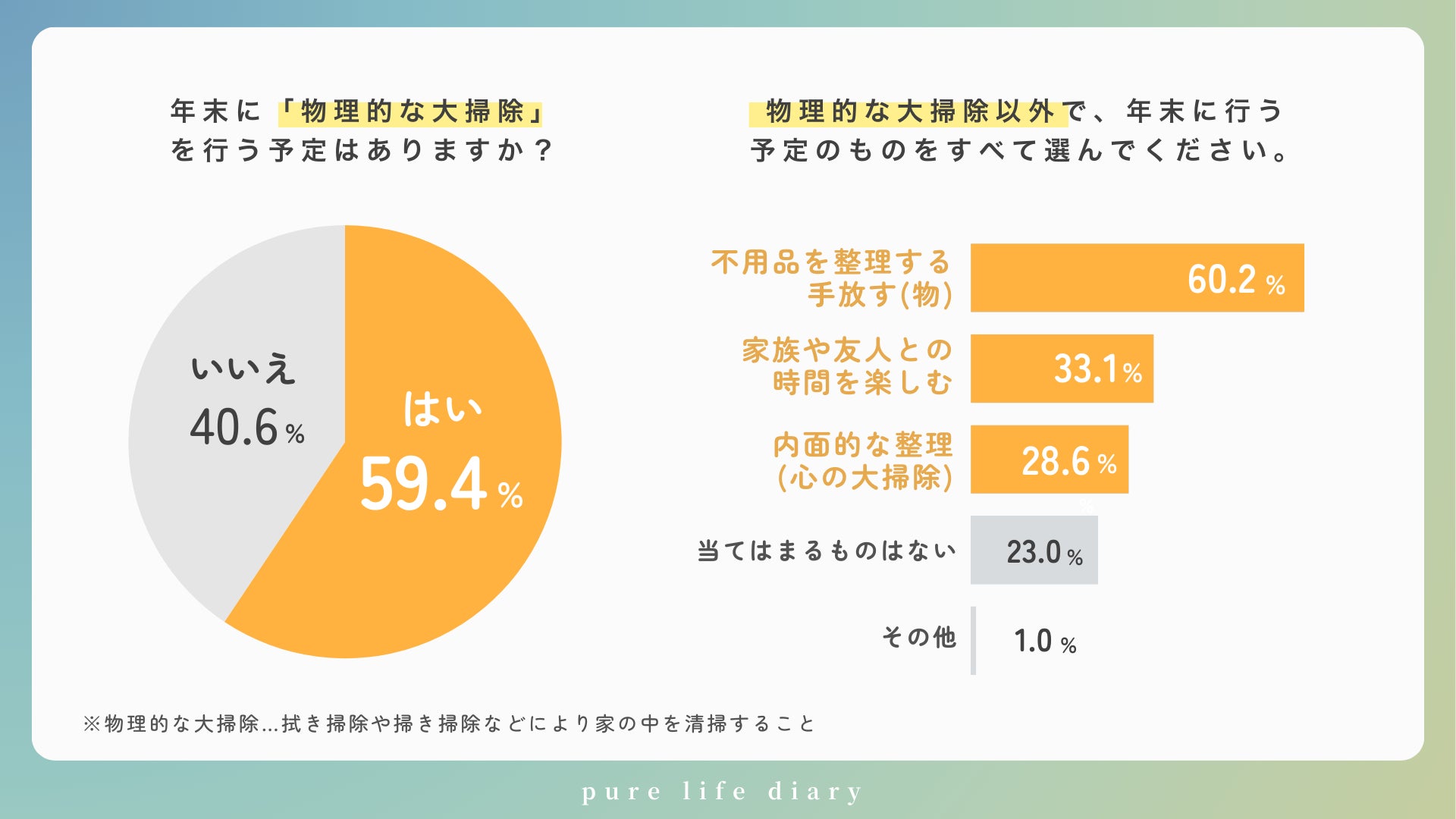 年末に物理的な大掃除を行う予定があると答えた人は59.4%。「物理的な大掃除以外で行う予定があるもの」を聞くと、1番多かった回答は「不用品を整理する・手放す(物)」で60.2%、次いで「家族や友人との時間を楽しむ」が33.1%、「内面的な整理(心の大掃除)」が28.6%でした。
