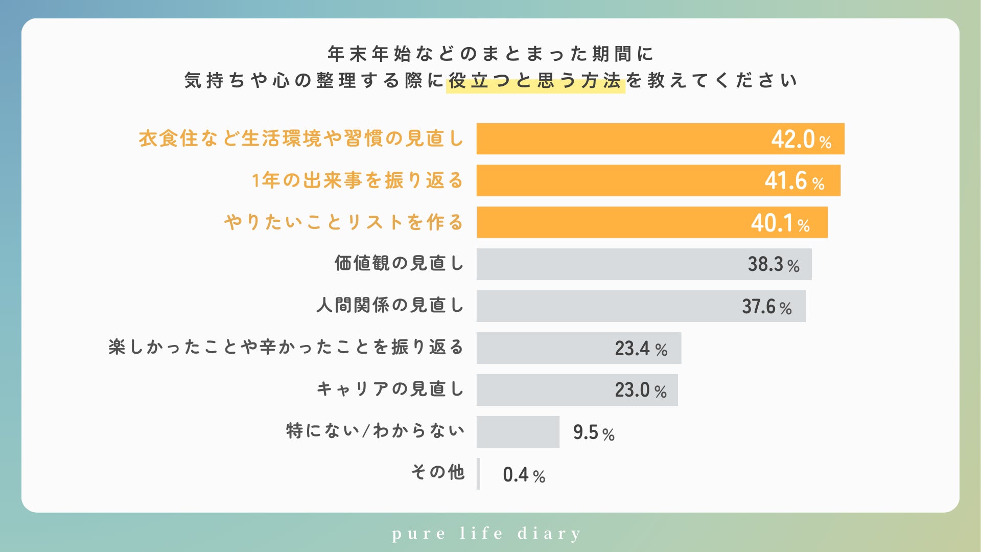 「年末年始に内面的な整理を行う際に役立つと思う方法は何か」を聞くと、1位は「衣食住など生活環境や習慣の見直し」で42.0%、次いで「1年の出来事を振り返る」が41.6%、「やりたいことリストを作る」が40.1%でした。