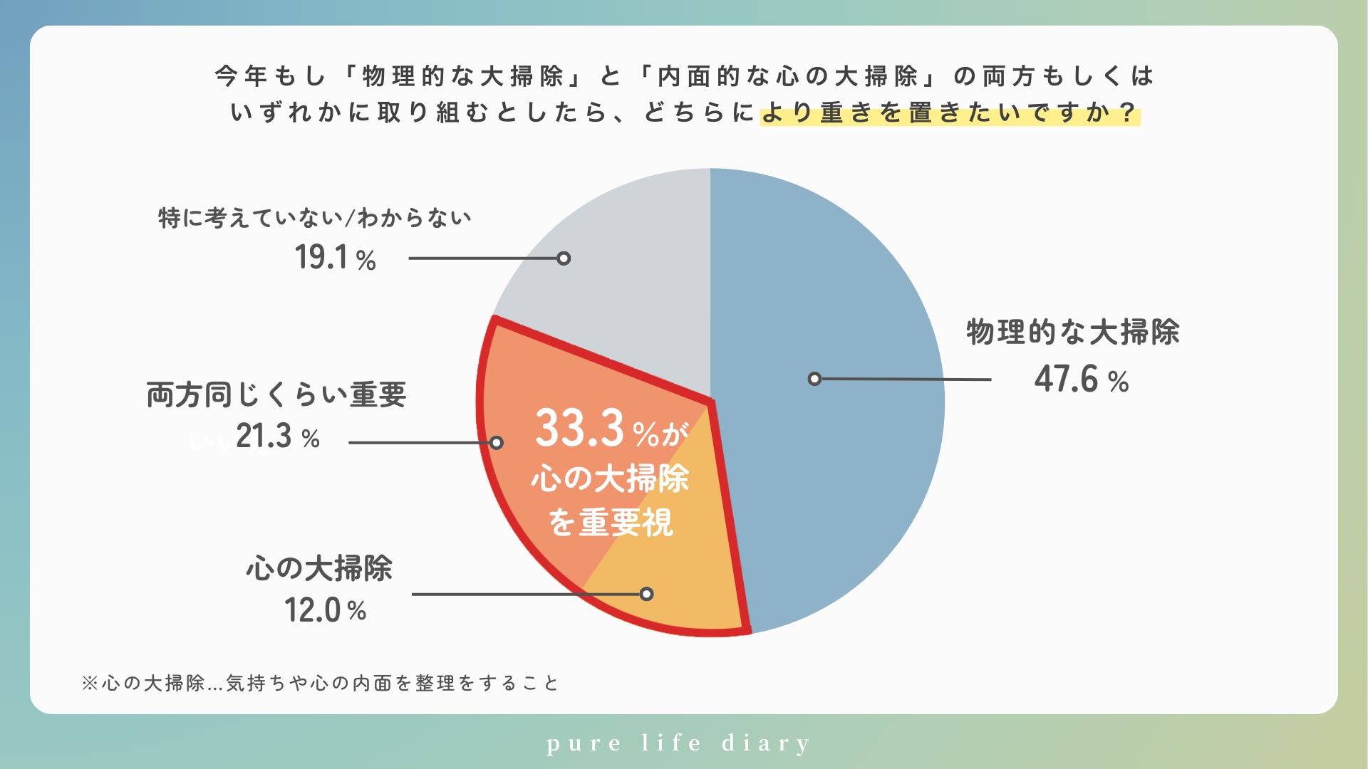 「今年は”物理的な大掃除”と”心の大掃除”どちらに重きを置きたいか」を聞いたところ、47.6%が「物理的な大掃除」と回答。「心の大掃除(内面的な整理)」は12%という結果でしたが、「両方同じくらい重要」と回答した21.3%を含めると33.3%と、約3割が今年の年末の過ごし方として「内面の整理」に意欲的なことがわかりました。