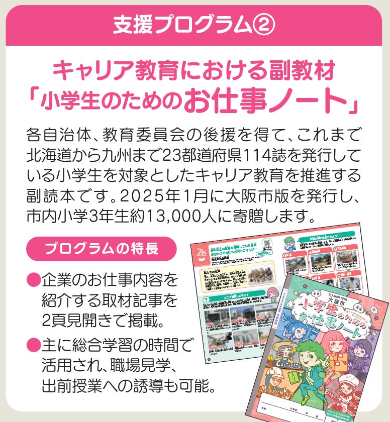 各自治体、教育委員会の後援を得て、これまで北海道から九州まで23都道府県114誌を発行している小学生を対象としたキャリア教育を推進する副読本です。2025年1月に大阪市版を発行し、市内小学3年生約13,000人に寄贈します。
