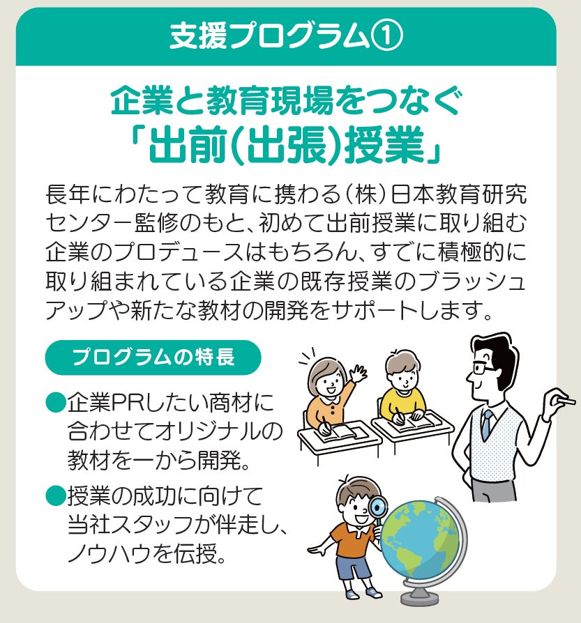 長年にわたって教育に携わる株式会社日本教育研究センター監修のもと、初めて出前授業に取り組む企業のプロデュースはもちろん、すでに積極的に取り組まれている企業の既存授業のブラッシュアップや新たな教材の開発をサポートします。