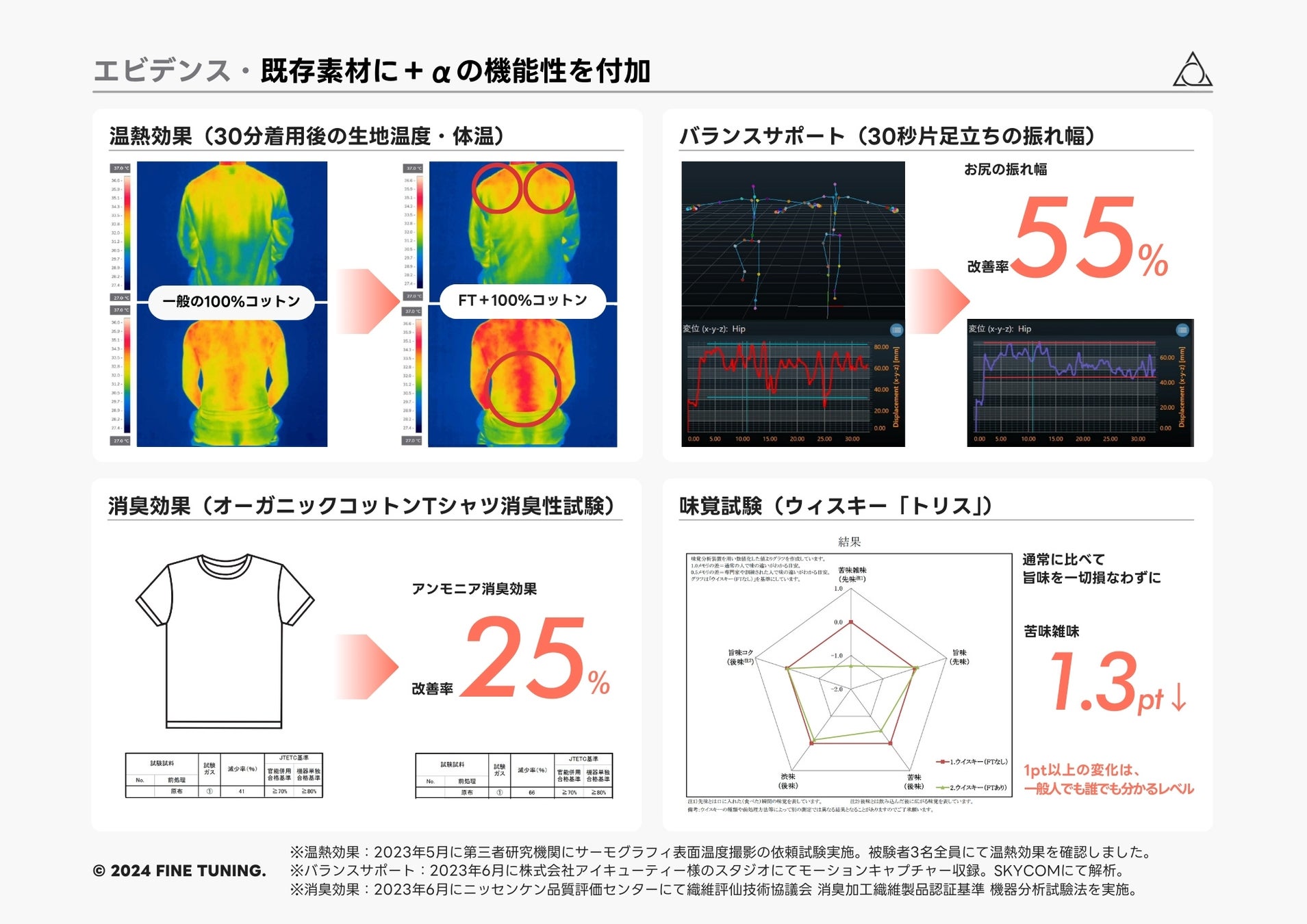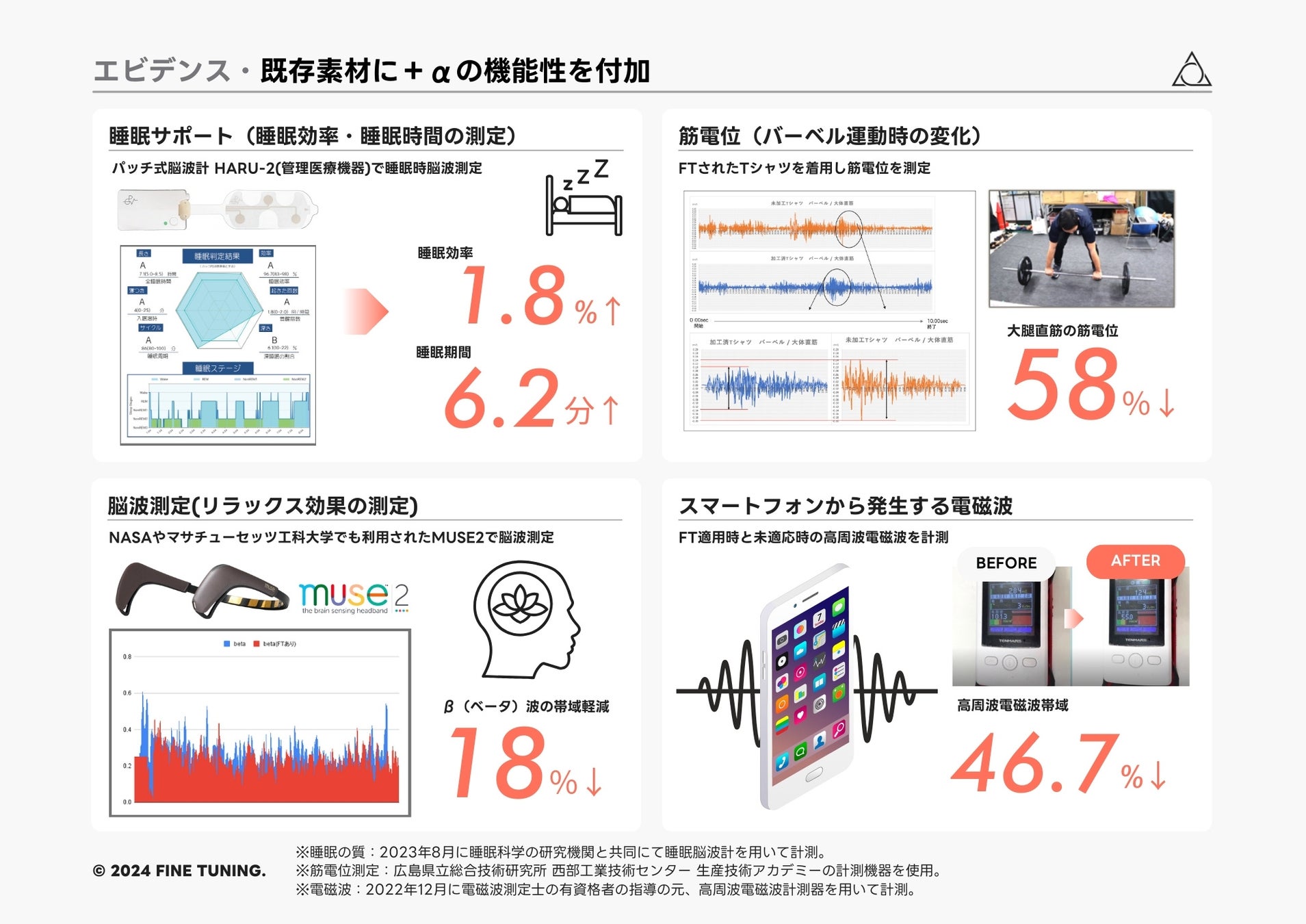 弊社では、FINE TUNING技術(FT加工)を活用し企業様、第三者研究機関、モニターユーザー様などと連携し、様々な検証、エビデンスデータ収集を日々行っております。