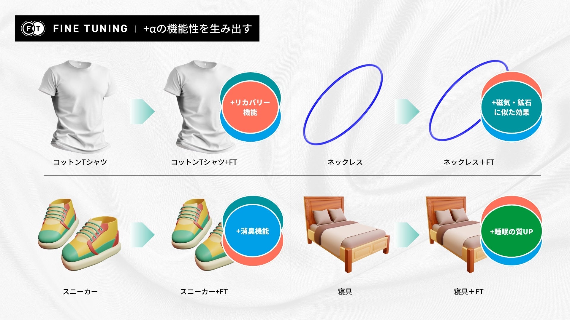 FT加工することによって、対象物の見た目やデザインを変えずに、+αの機能性を生み出すことが可能になります。たとえば、アパレルやアクセサリー商品にリカバリーウェアや磁気ネックレスと同様のバランスサポート機能を加えたり、消臭機能を加えたり、遠赤外線効果を増加させたり、有害な電磁波の帯域を削るといった様々な機能性を加えることができます。