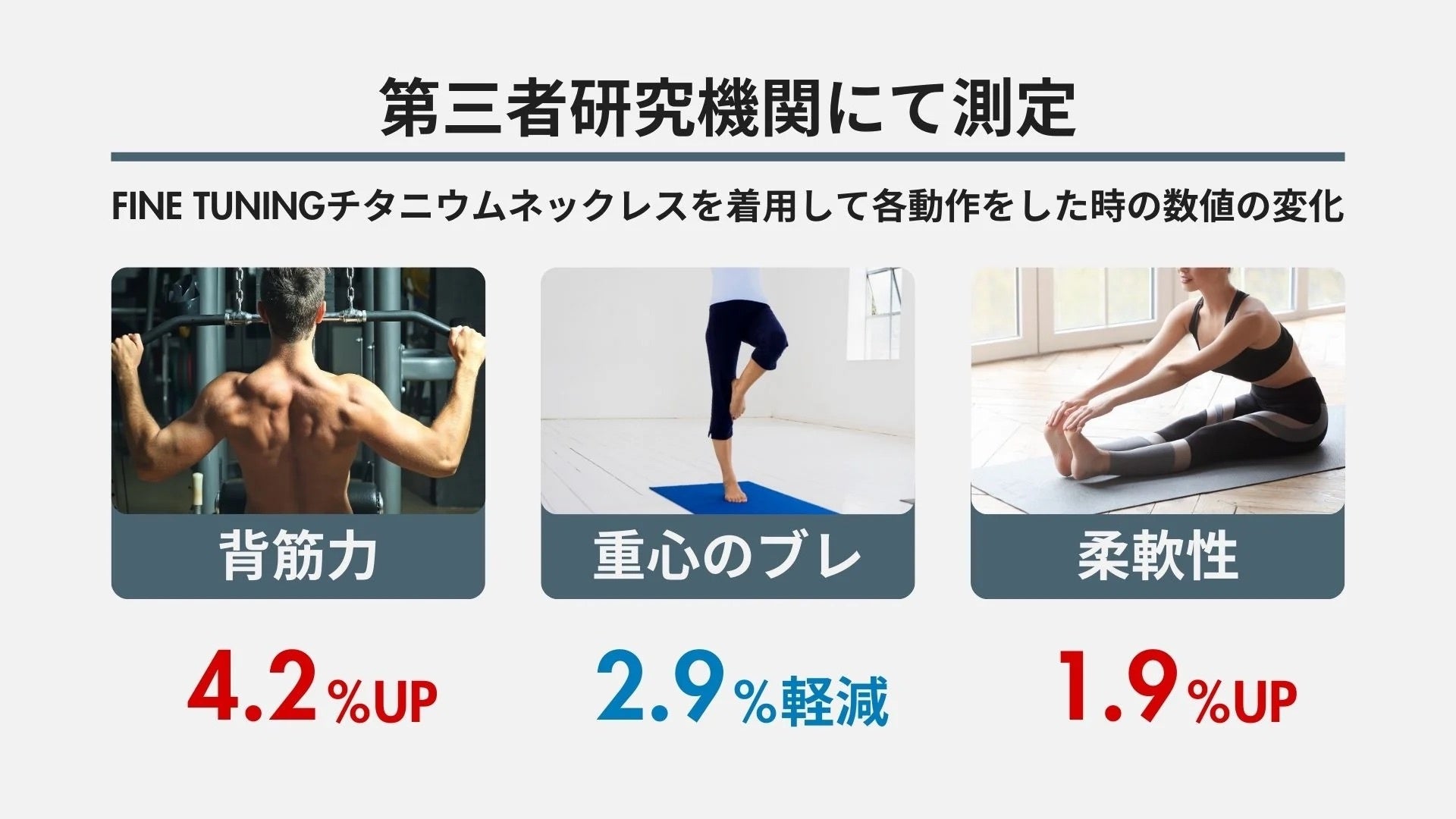このテストは、FINE TUNINGが施されているか、否か、調べることが出来るシンプルなデモンストレーションではありますが、現時点で、94%の方が体感していただいております。これは、他のリカバリーウェアや磁気アイテムを身につけた際のテスト結果よりも、高い数値になっており、多くの方に「バランスが整う」体感を味わうことができる再現性の高い技術です。