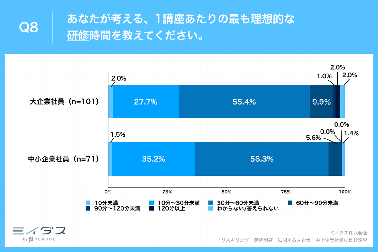 Q7で「(好きな時間に学習できる)eラーニング形式」と回答した方に、「Q8.あなたが考える、1講座あたりの最も理想的な研修時間を教えてください。」と質問したところ、大企業社員(n=101)は「10分~30分未満」が27.7%、「30分~60分未満」が55.4%、中小企業社員(n=71)は「10分~30分未満」が35.2%、「30分~60分未満」が56.3%という回答となりました。