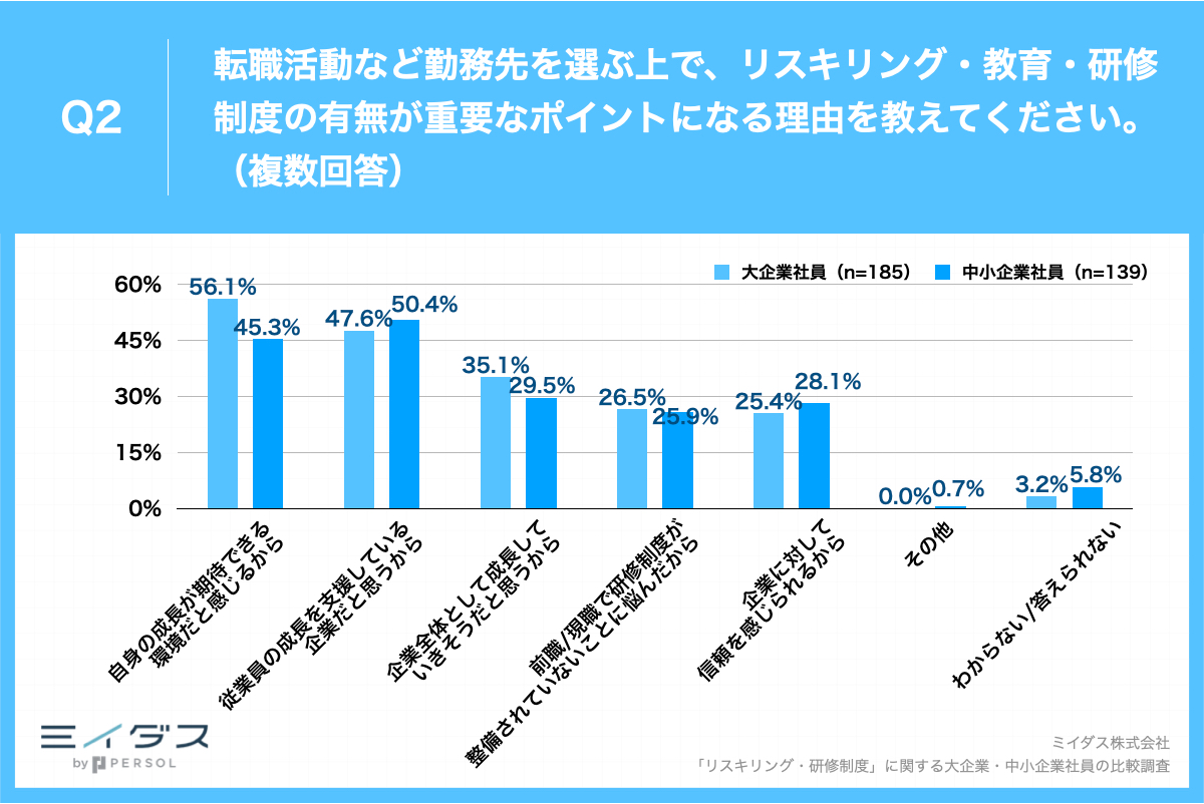 Q1で「非常にそう思う」「ややそう思う」と回答した方に、「Q2.転職活動など勤務先を選ぶ上で、リスキリング・教育・研修制度の有無が重要なポイントになる理由を教えてください。(複数回答)」と質問したところ、大企業社員(n=185)は「自身の成長が期待できる環境だと感じるから」が56.1%、「従業員の成長を支援している企業だと思うから」が47.6%、「企業全体として成長していきそうだと思うから」が35.1%、中小企業社員(n=139)は「従業員の成長を支援している企業だと思うから」が50.4%、「自身の成長が期待できる環境だと感じるから」が45.3%、「企業全体として成長していきそうだと思うから」が29.5%という回答となりました。