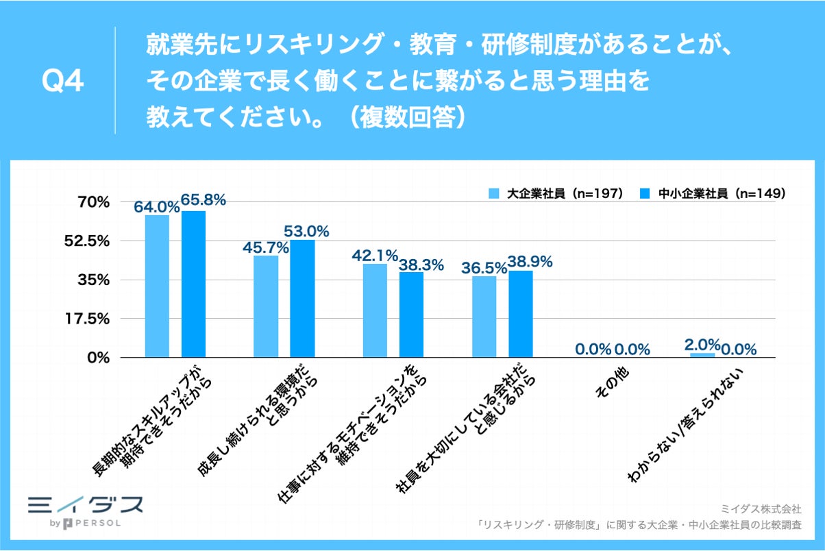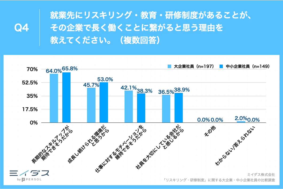 Q3で「非常にそう思う」「ややそう思う」と回答した方に、「Q4.就業先にリスキリング・教育・研修制度があることが、その企業で長く働くことに繋がると思う理由を教えてください。(複数回答)」と質問したところ、大企業社員(n=197)は「長期的なスキルアップが期待できそうだから」が64.0%、「成長し続けられる環境だと思うから」が45.7%、「仕事に対するモチベーションを維持できそうだから」が42.1%、中小企業社員(n=149)は「長期的なスキルアップが期待できそうだから」が65.8%、「成長し続けられる環境だと思うから」が53.0%、「社員を大切にしている会社だと感じるから」が38.9%という回答となりました。