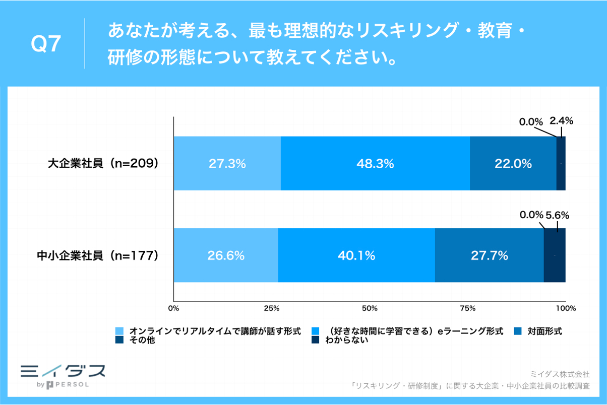 Q5で「非常にそう思う」「ややそう思う」と回答した方に、「Q7.あなたが考える、最も理想的なリスキリング・教育・研修の形態について教えてください。」と質問したところ、大企業社員(n=209)は「オンラインでリアルタイムで講師が話す形式」が27.3%、「(好きな時間に学習できる)eラーニング形式」が48.3%、中小企業社員(n=177)は「オンラインでリアルタイムで講師が話す形式」が26.6%、「(好きな時間に学習できる)eラーニング形式」が40.1%という回答となりました。