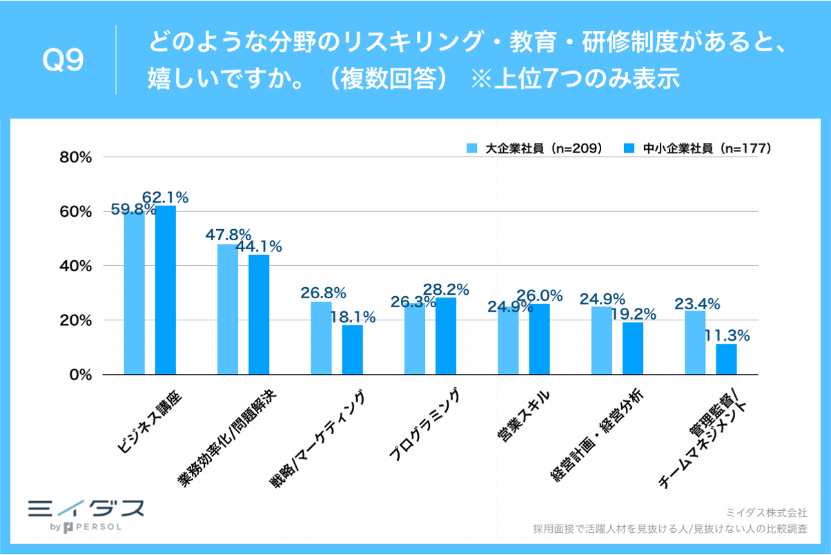 Q5で「非常にそう思う」「ややそう思う」と回答した方に、「Q9.どのような分野のリスキリング・教育・研修制度があると、嬉しいですか。(複数回答)」と質問したところ、大企業社員(n=209)は「ビジネス講座(ビジネス文書、Excel、プレゼンテーション、会計、ロジカルシンキングなど)」が59.8%、「業務効率化/問題解決」が47.8%、「戦略/マーケティング」が26.8%、中小企業社員(n=177)は、「ビジネス講座(ビジネス文書、Excel、プレゼンテーション、会計、ロジカルシンキングなど)」が62.1%、「業務効率化/問題解決」が44.1%、「プログラミング」が28.2%という回答となりました。