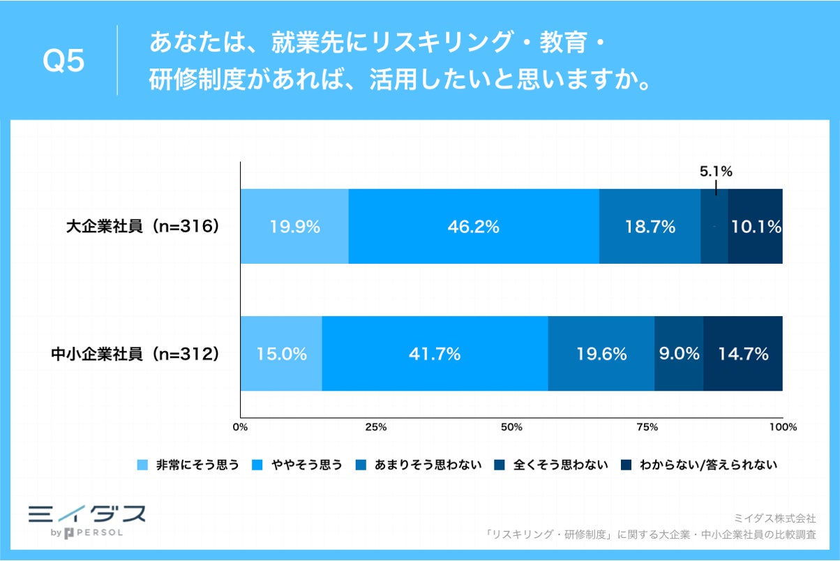 「Q5.あなたは、就業先にリスキリング・教育・研修制度があれば、活用したいと思いますか。」と質問したところ、大企業社員(n=316)は「非常にそう思う」が19.9%、「ややそう思う」が46.2%、中小企業社員(n=312)は「非常にそう思う」が15.0%、「ややそう思う」が41.7%という回答となりました。