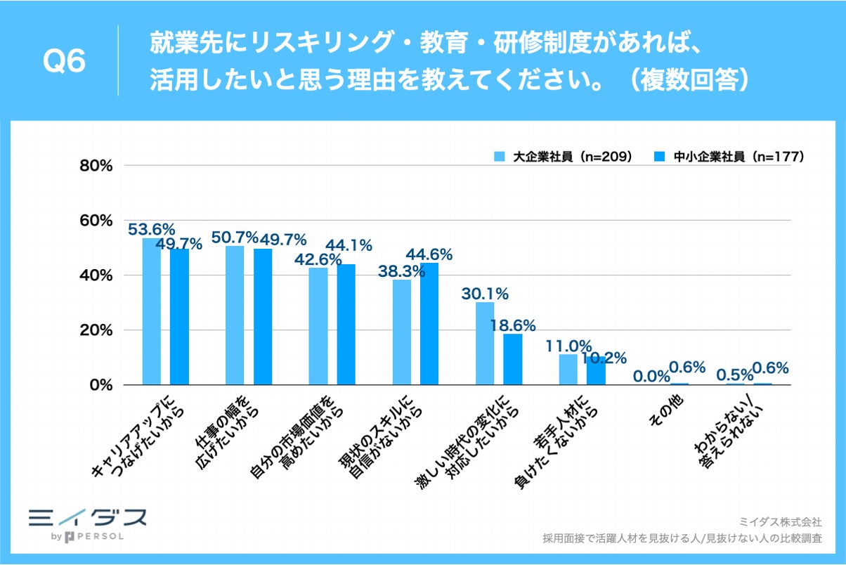 Q5で「非常にそう思う」「ややそう思う」と回答した方に、「Q6.就業先にリスキリング・教育・研修制度があれば、活用したいと思う理由を教えてください。(複数回答)」と質問したところ、大企業社員(n=209)は「キャリアアップにつなげたいから」が53.6%、「仕事の幅を広げたいから」が50.7%、「自分の市場価値を高めたいから」が42.6%、中小企業社員(n=177)は「キャリアアップにつなげたいから」が49.7%、「仕事の幅を広げたいから」が49.7%、「現状のスキルに自信がないから」が44.6%という回答となりました。