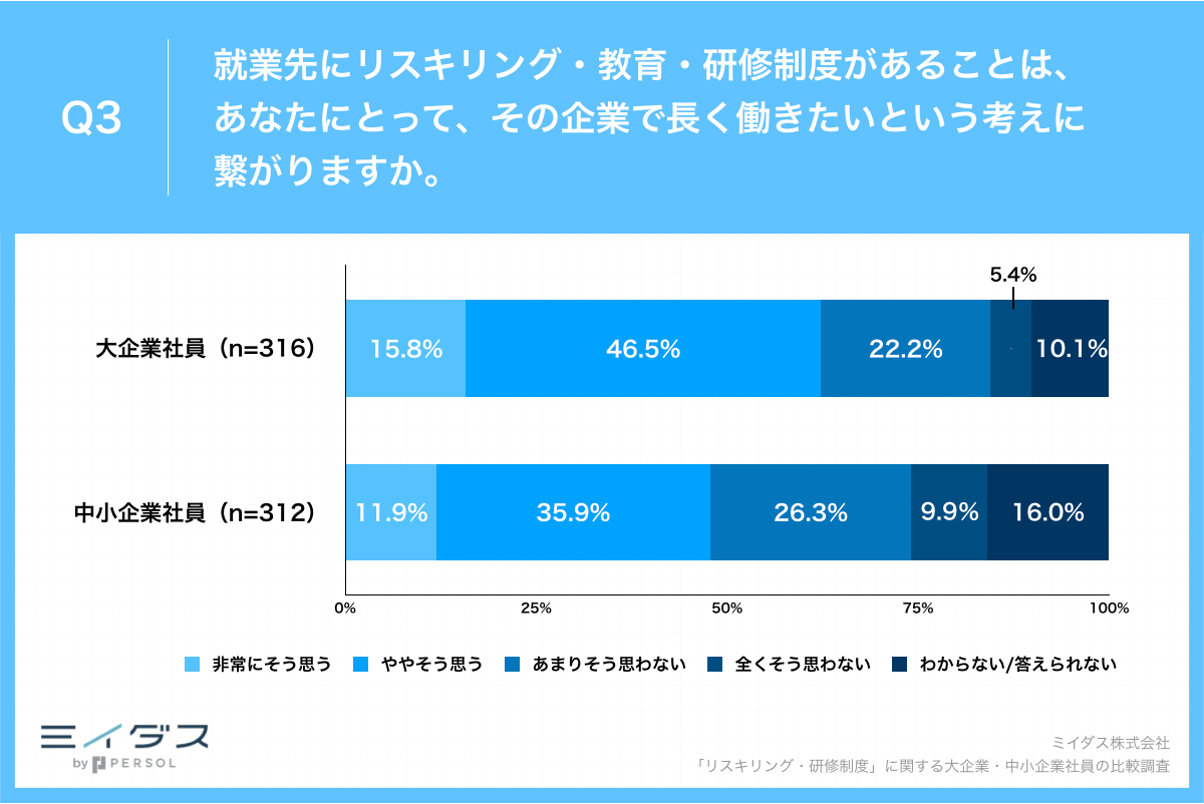 「Q3.就業先にリスキリング・教育・研修制度があることは、あなたにとって、その企業で長く働きたいという考えに繋がりますか。」と質問したところ、大企業社員(n=316)は「非常にそう思う」が15.8%、「ややそう思う」が46.5%、中小企業社員(n=312)は「非常にそう思う」が11.9%、「ややそう思う」が35.9%という回答となりました。