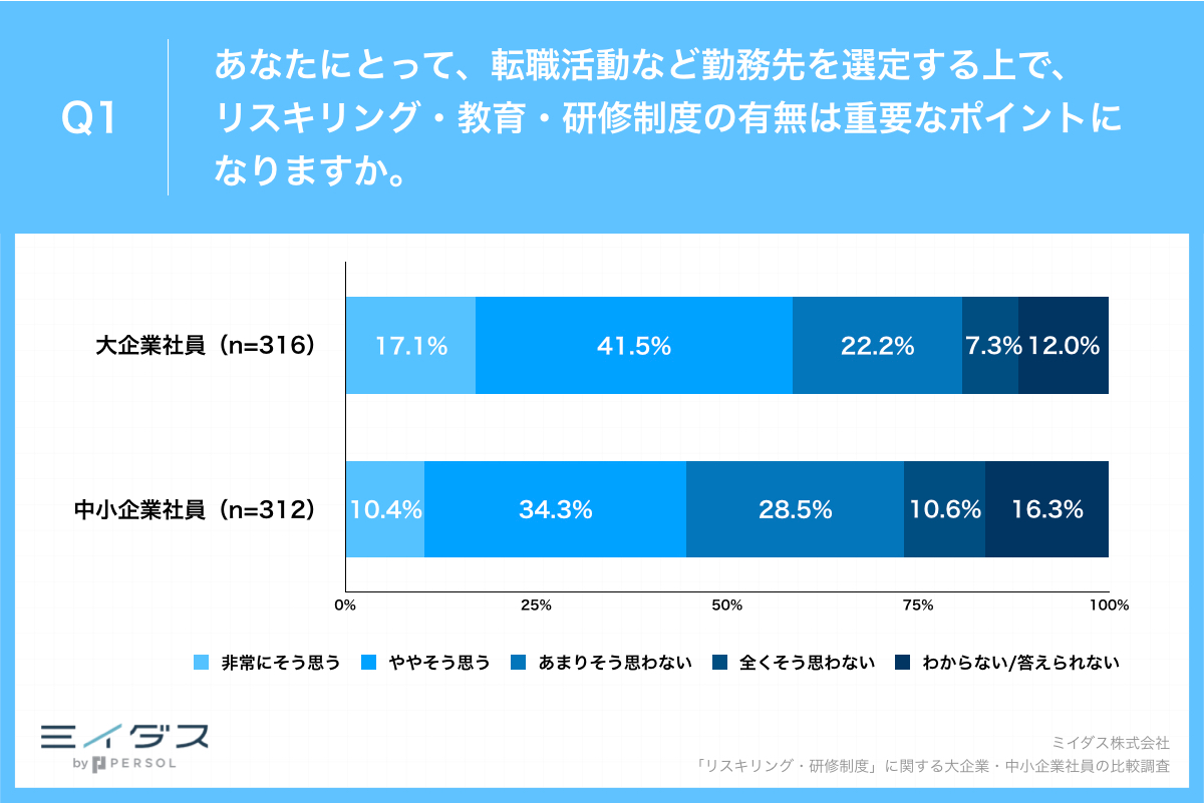 「Q1.あなたにとって、転職活動など勤務先を選定する上で、リスキリング・教育・研修制度の有無は重要なポイントになりますか。」と質問したところ、大企業社員(n=316)は「非常にそう思う」が17.1%、「ややそう思う」が41.5%、中小企業社員(n=312)は「非常にそう思う」が10.4%、「ややそう思う」が34.3%という回答となりました。